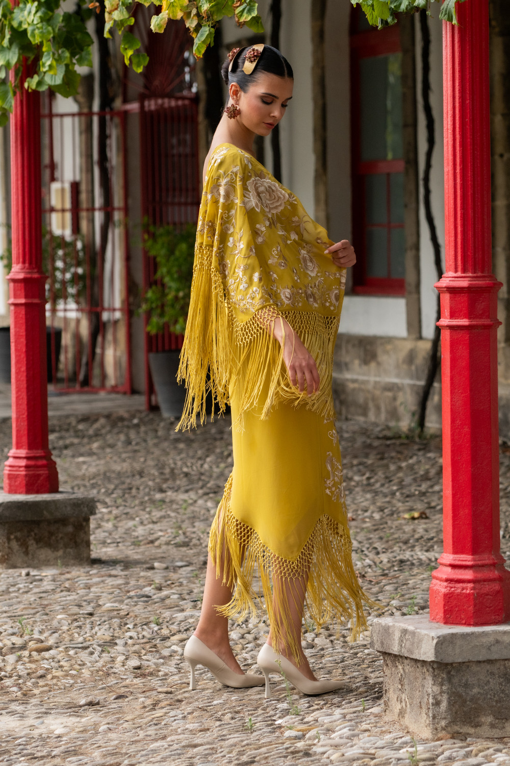 Referencia: S0023AMantoncillo mostaza pico bordado mantón en tonos beige con flores y pájaros, enrejado con flecos beige.