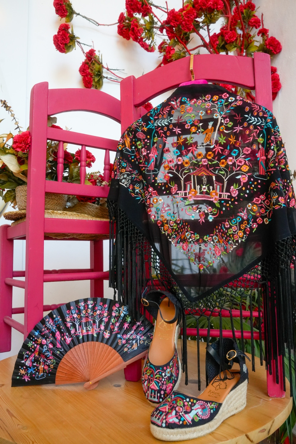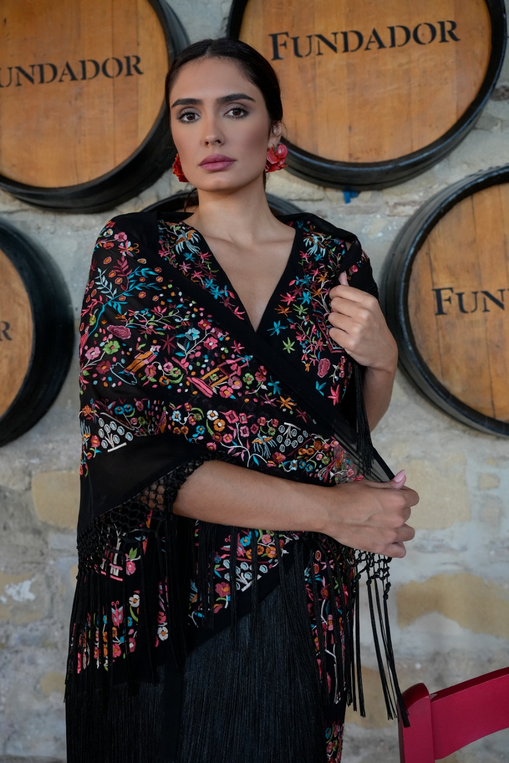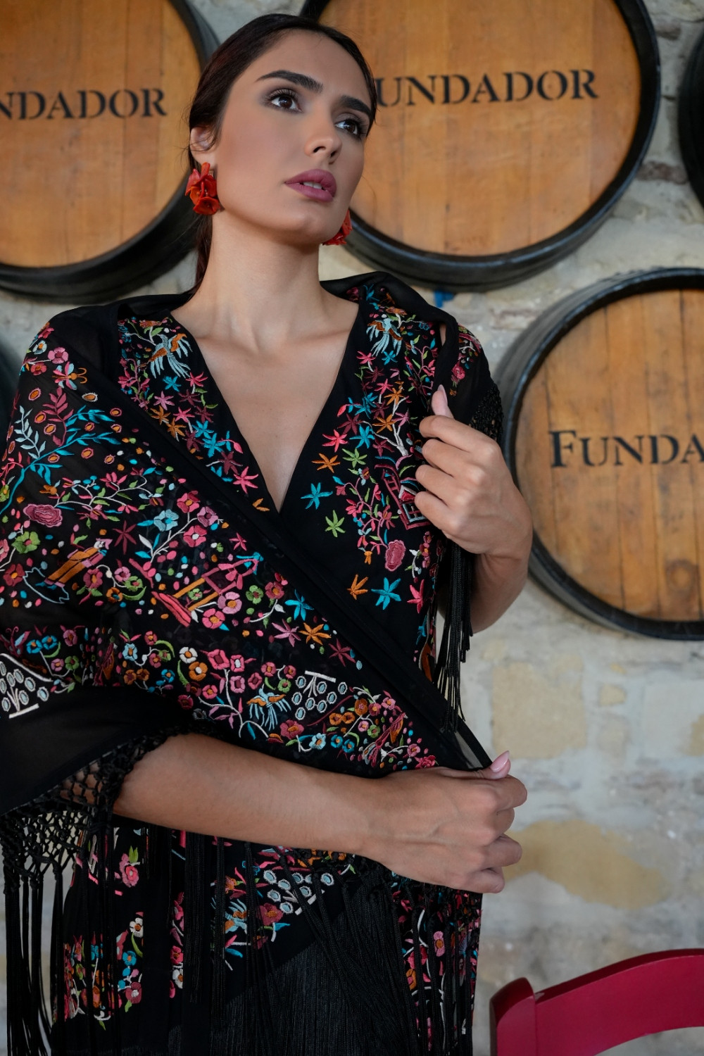 Referencia: S0047CMantón Loto negro bordado antiguo con motivos chinos Káhyra