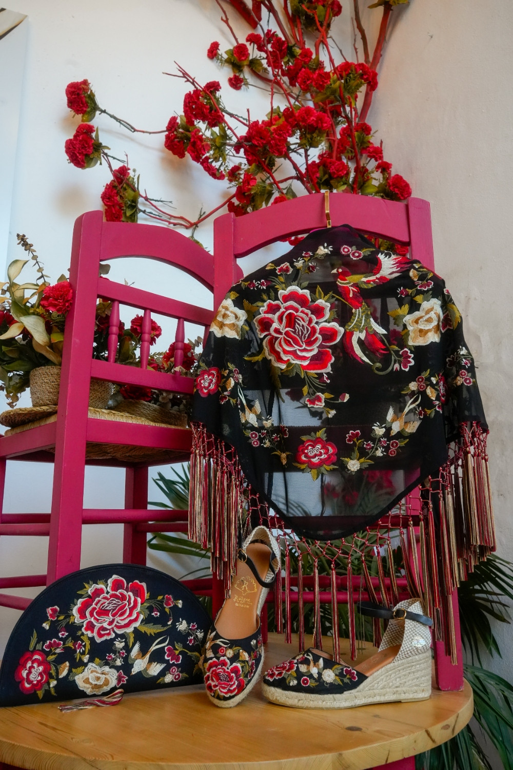 Mantón Flamenco negro bordado flores Káhyra