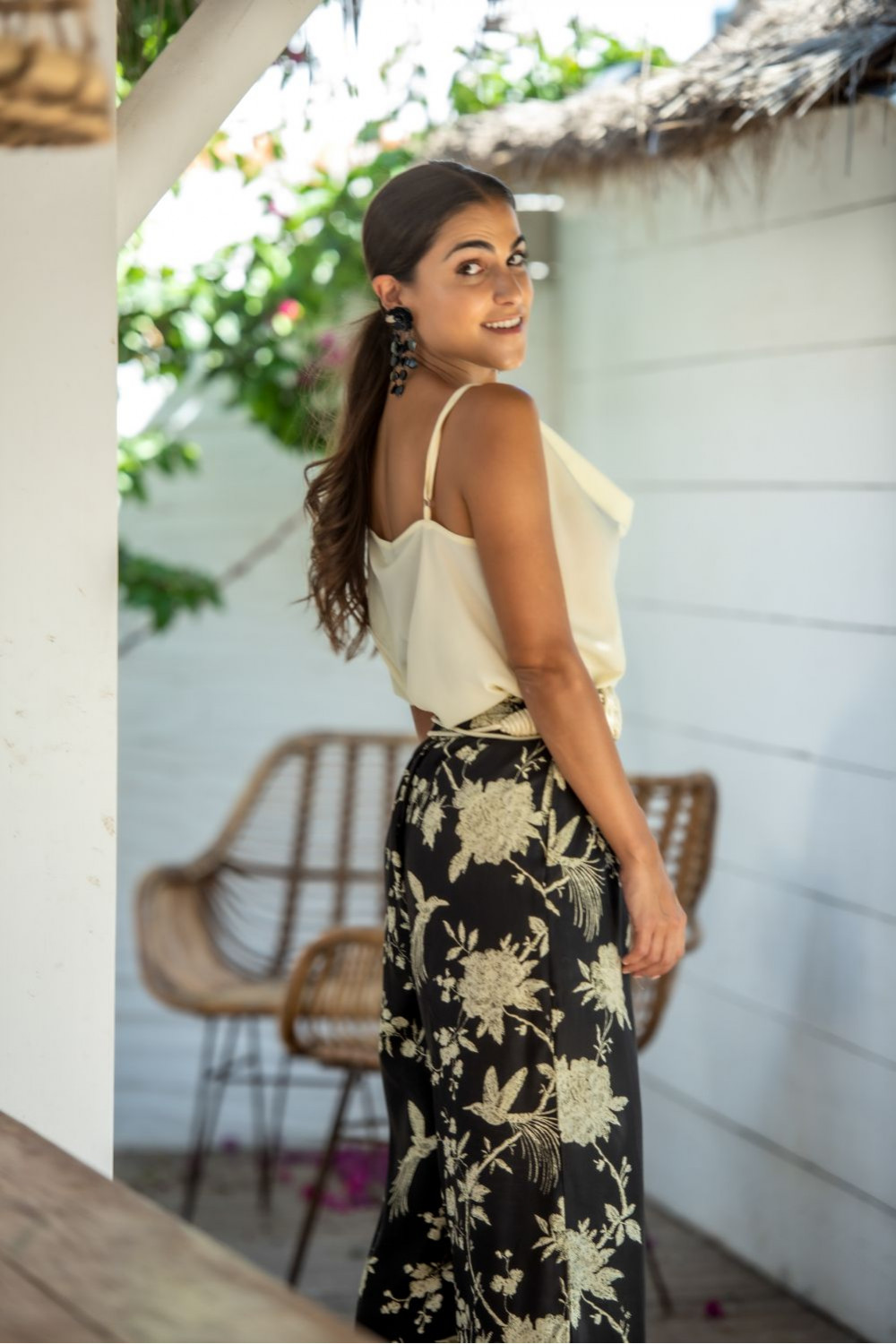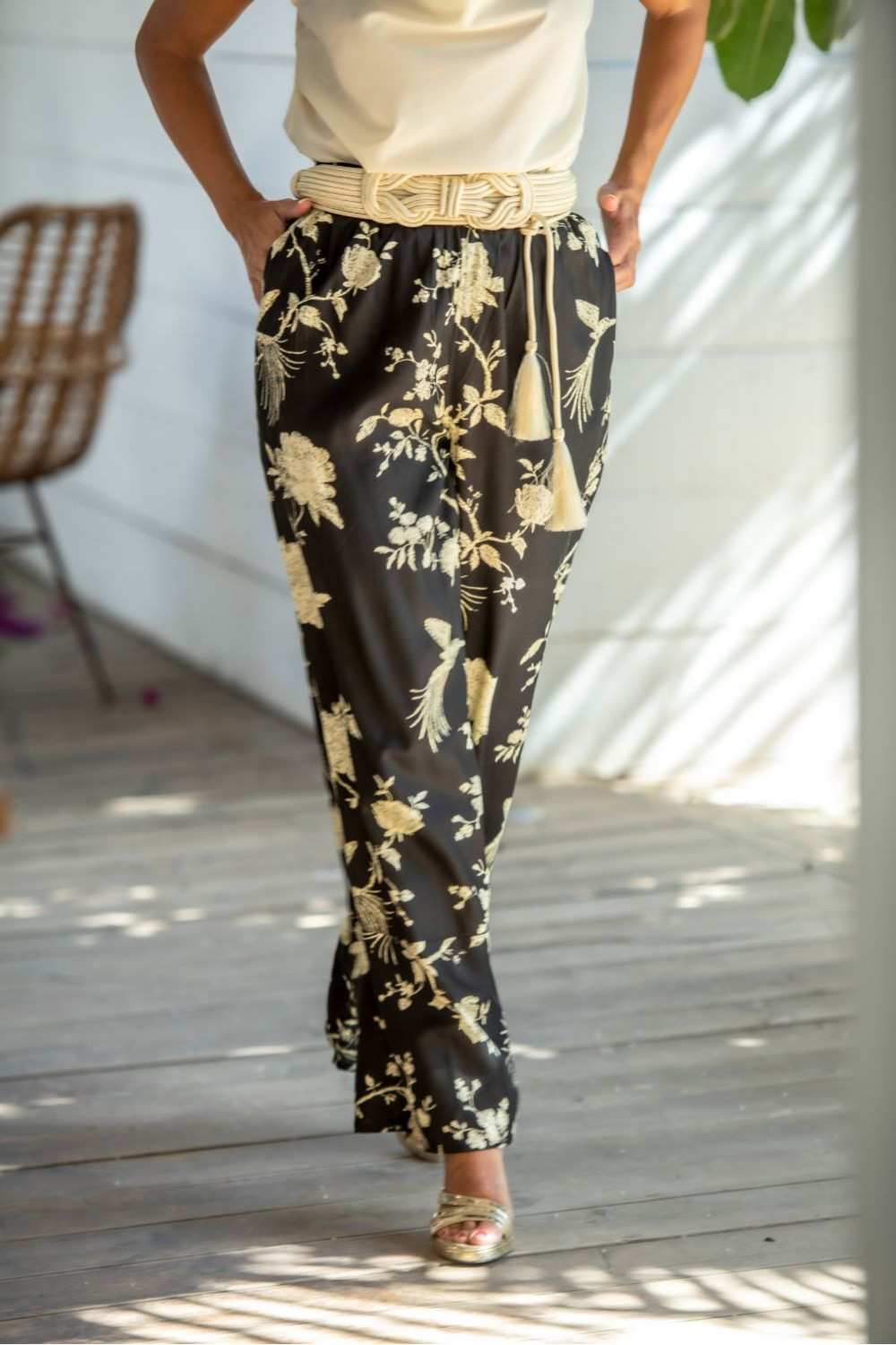Pantalón kavala de viscosa con pata ancha negro con flores de mantón beige.