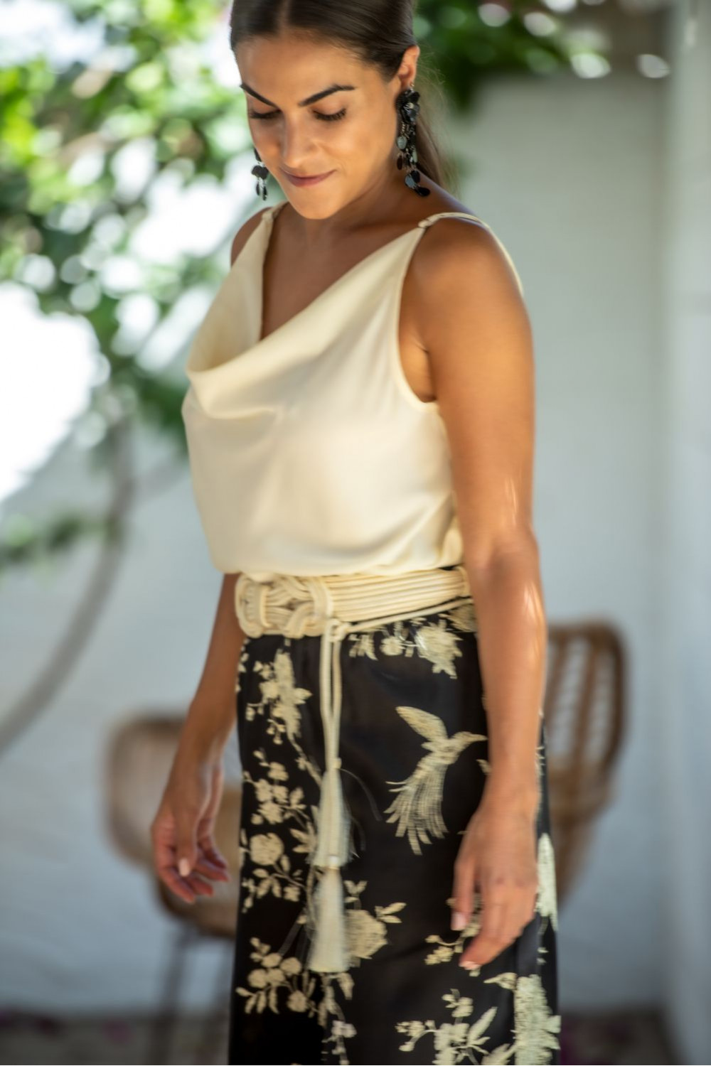 Top sol beige sunset & moon polysilk con tirantas y cuello bocón.CALIDAD: 70% POLIESTER 30% SEDA.