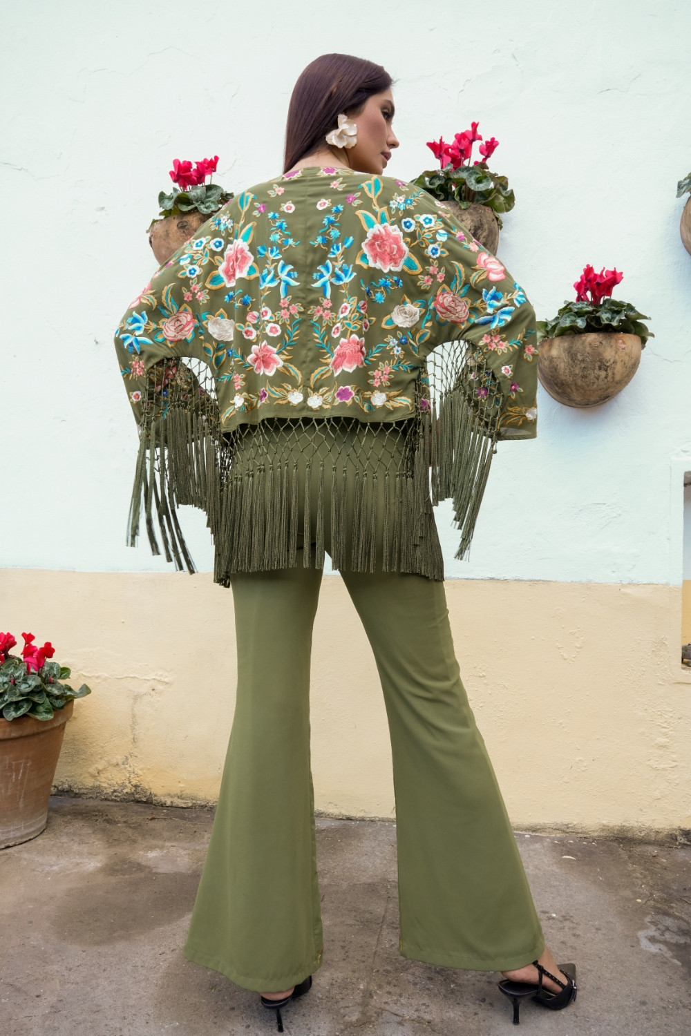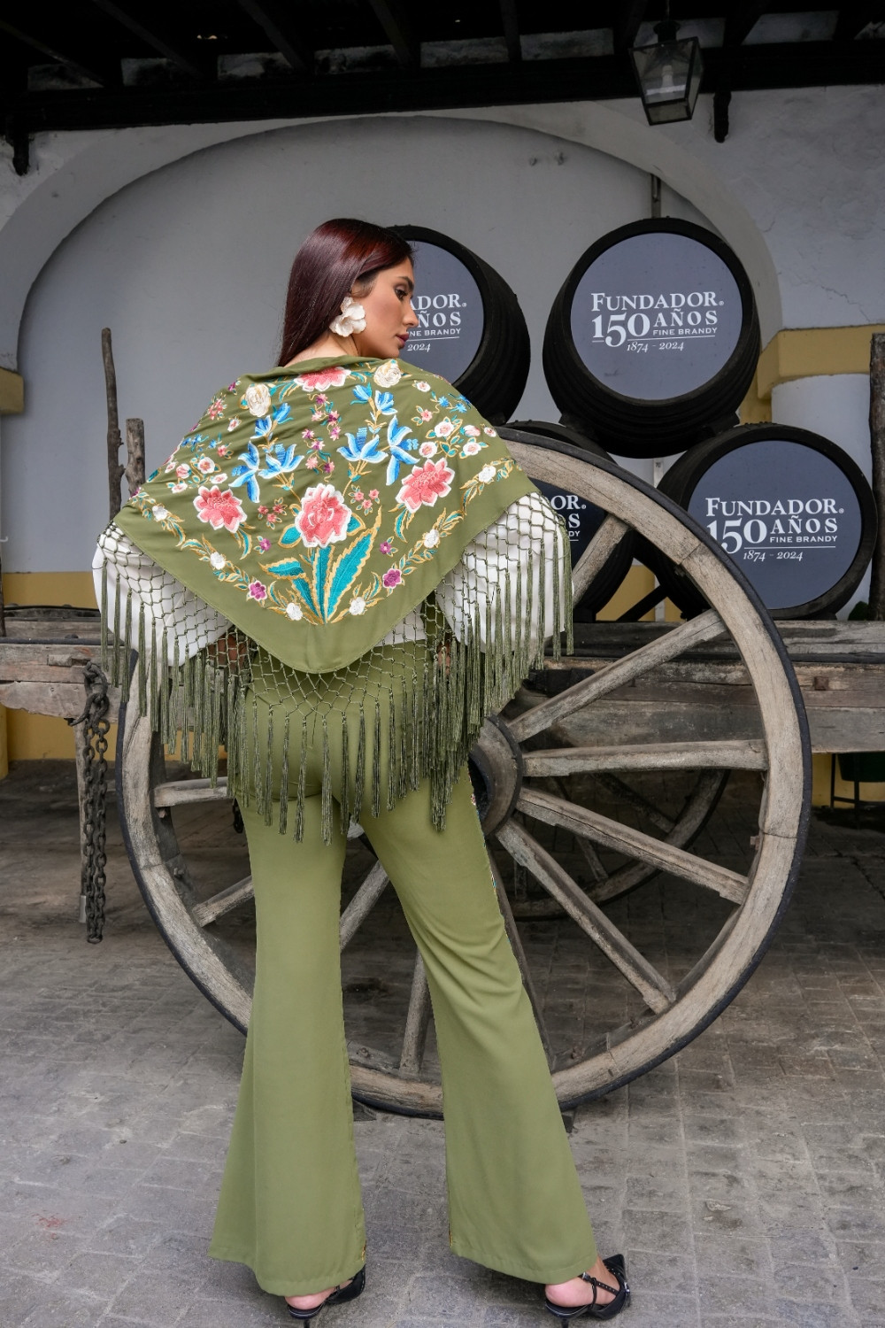 Referencia: CP0240APantalón Valle verde de gasa, bordado de mantón con motivos florales Káhyra.