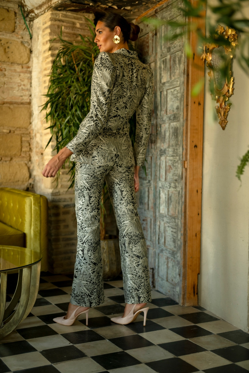 Referencia: CP0257CPantalón Perla negro tejido brocado con hilo dorado Kahyra. COMPOSICIÓN: 75%POLIÉSTER.25% VISCOSA