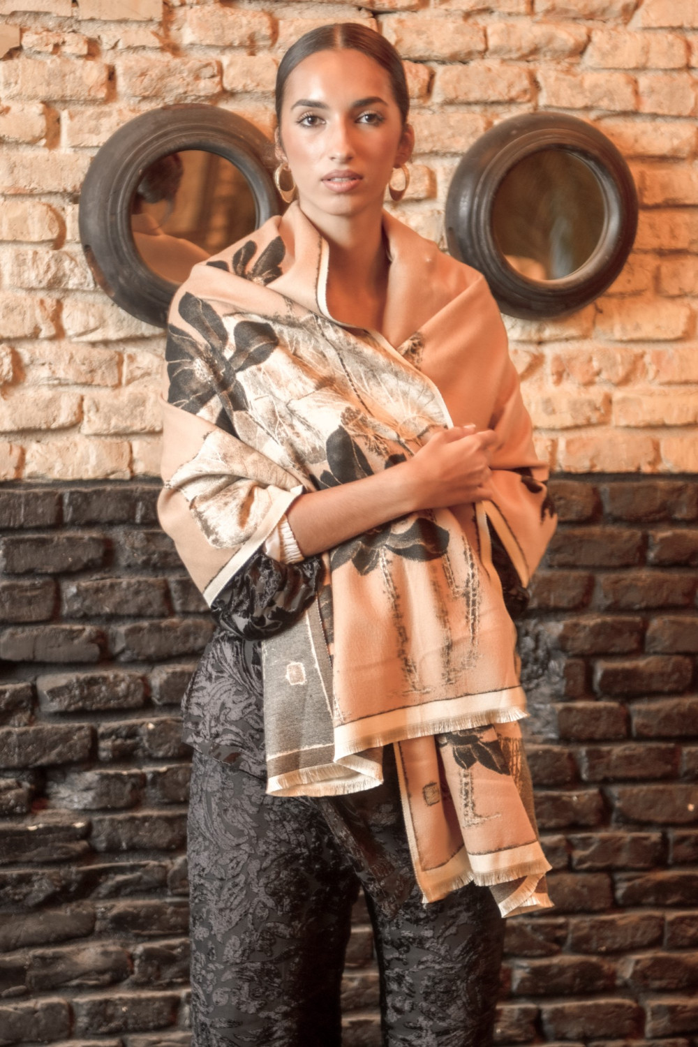 Referencia: S0036BPasmina estampado romántico con fondo beige y flores negras y beige