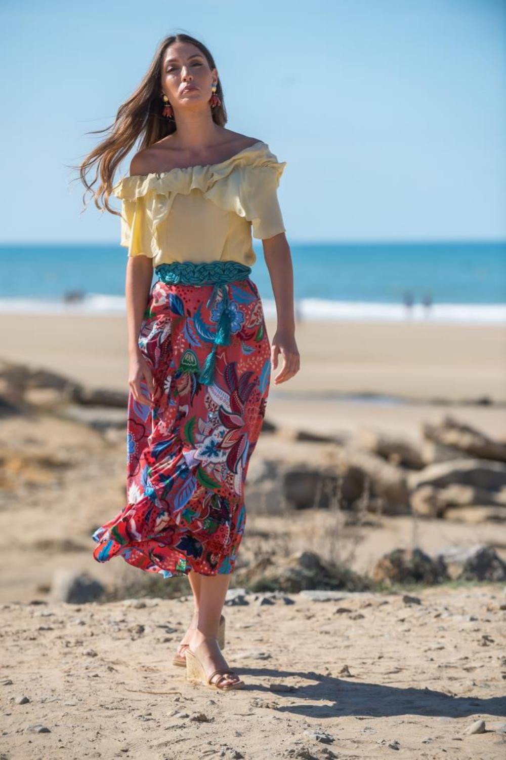Pantalón kavala de viscosa con pata ancha negro con flores de mantón beige.CALIDAD: 100% VISCOSE
