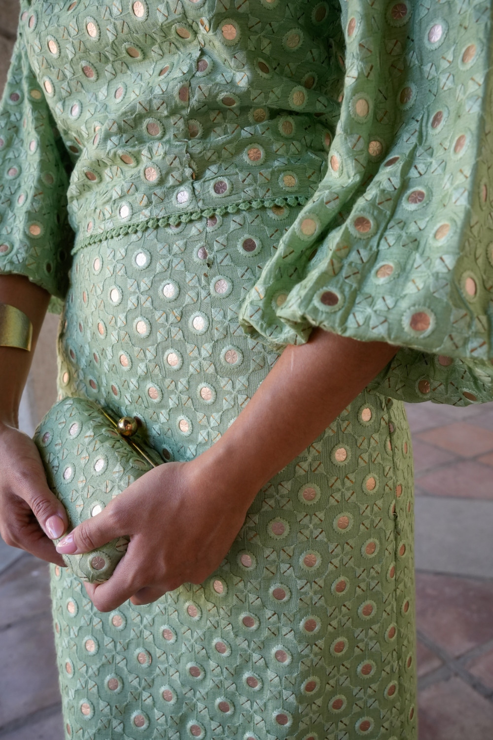 Top Cristal verde de tejido especial con incrustaciones efecto espejo crital e hilo bronce cuello barco y manga larga abullonada Kahyra. COMPOSICIÓN: 100% VISCOSA FORRO: 100% ALGODÓN ACCESORIOS: APLIQUES 100% ALGODON