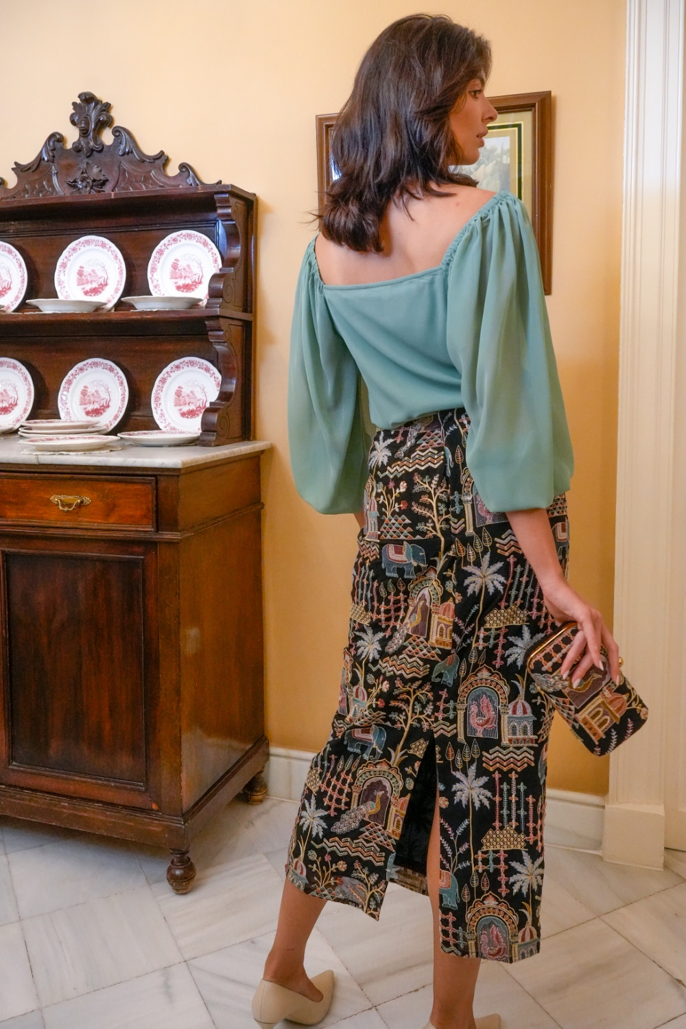 Top verde agua liso gasa con escote corazón y mangas abullonadas. Calidad: 100% Poliéster - Forro:100% Poliéster punto