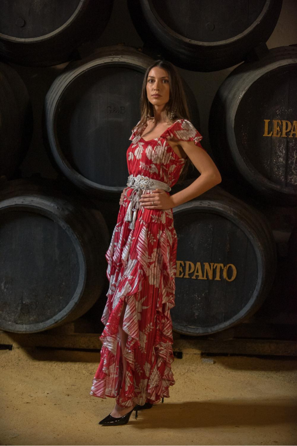 Vestido cruzado estampado Torre del Oro, taupe y coral, con volante en bajo remangado en cintura y volante en manga al codoCOMPOSICIÓN: 70% POLIESTER 30% SEDA