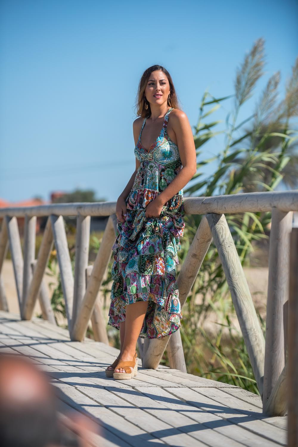 Vestido largo estampado burdeos con lunares beige , escote y espalda de pico adornado con volantitos, cintura fruncida y falda terminada en volantesCOMPOSICIÓN: 70% POLIESTER 30% SEDA