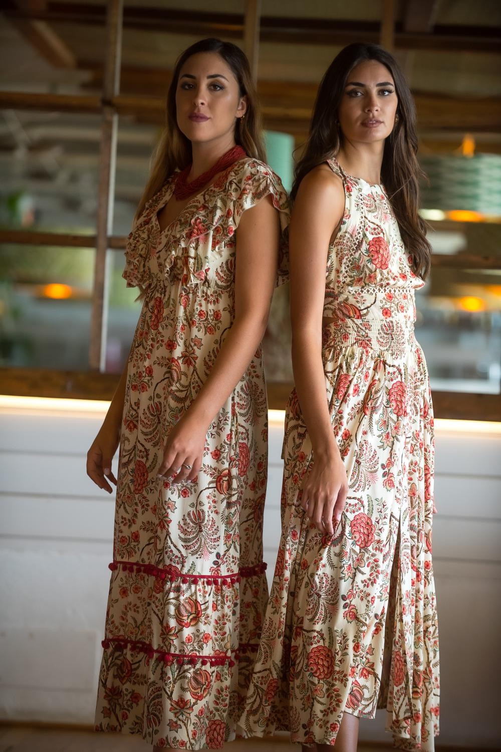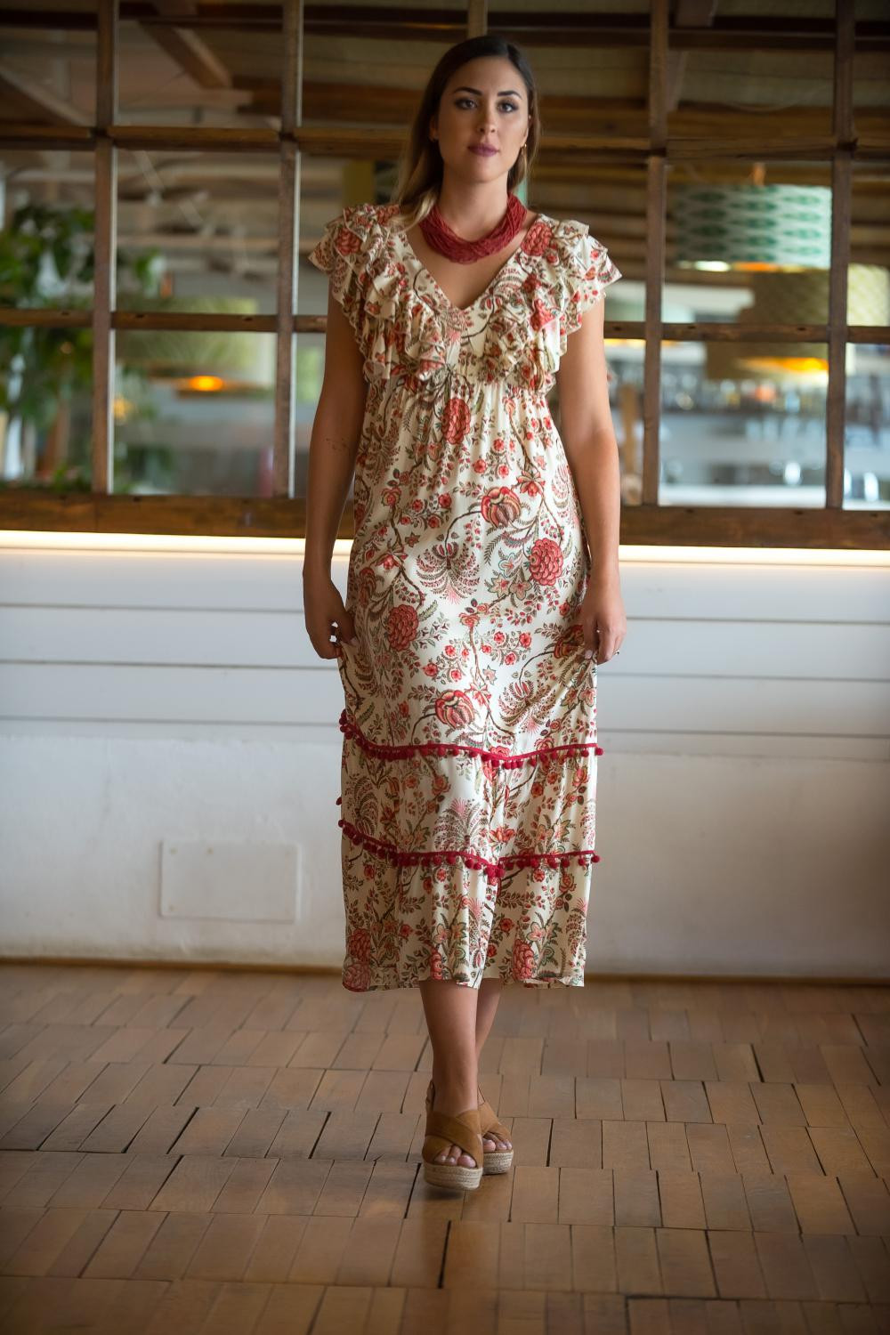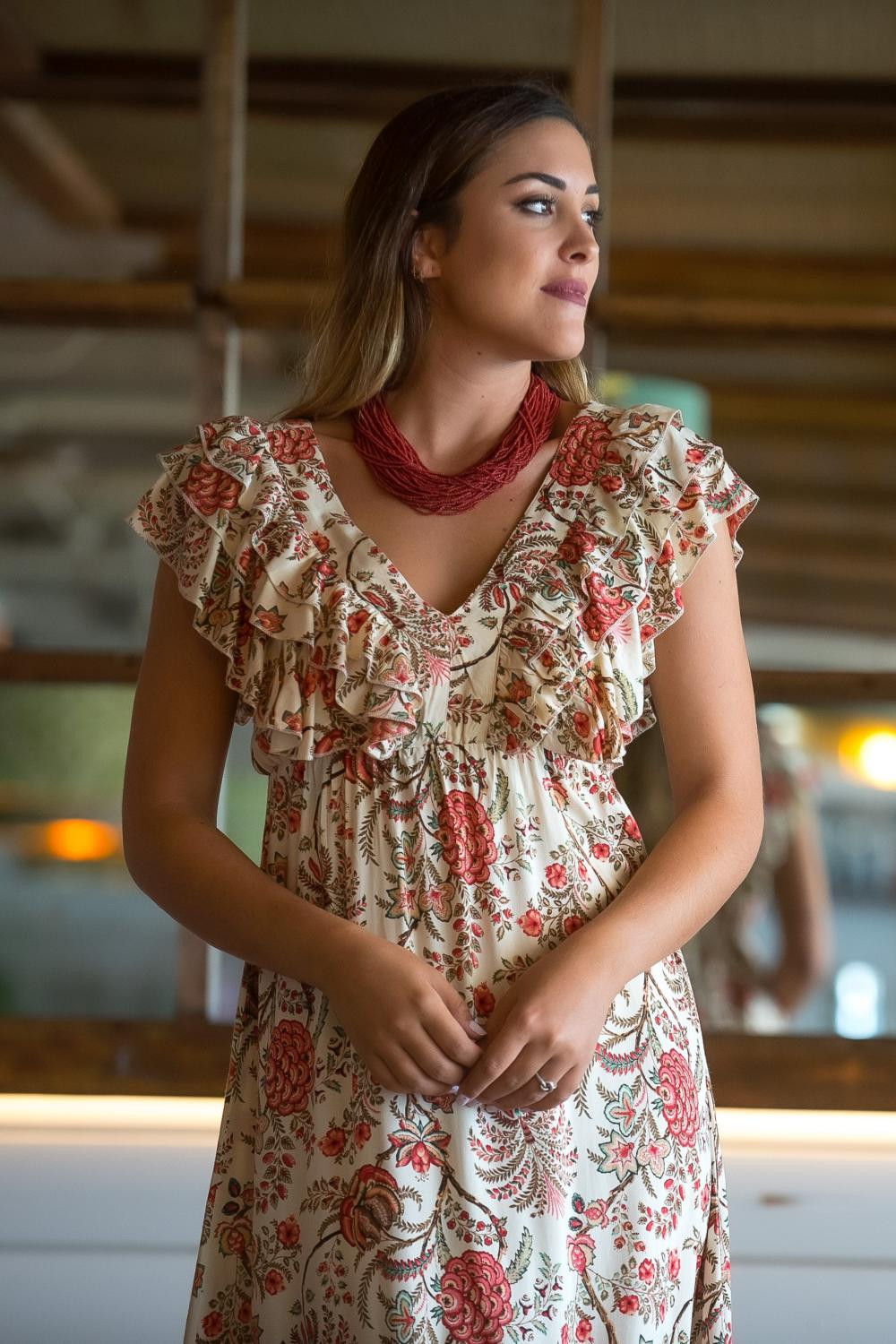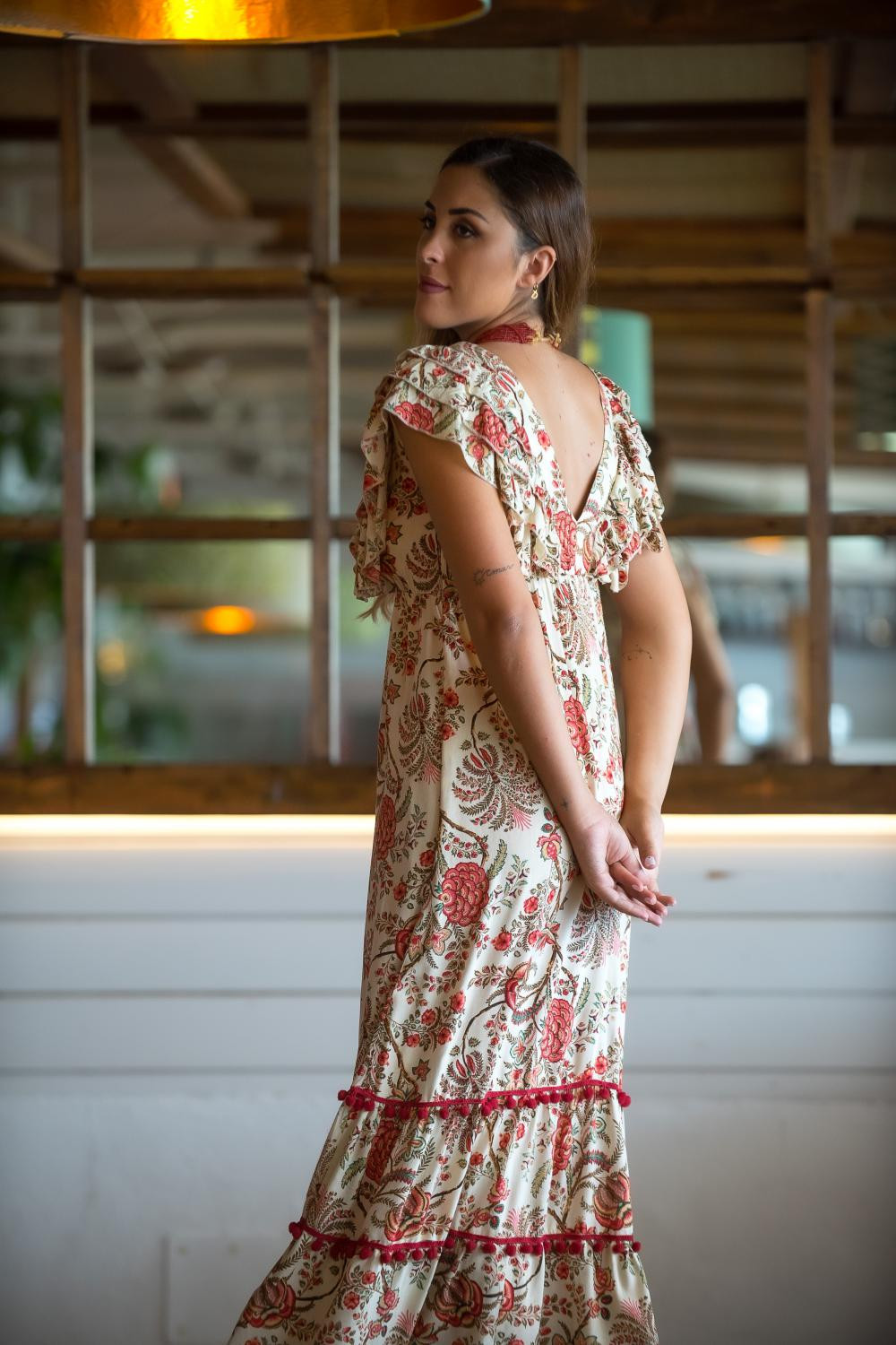 Vestido largo estampado Pitiminí, beige con adornos flores corales ,escote y espalda de pico con volantes en escote y espalda hasta cintura, sin mangas y detalle de cintas de morillas en la fada