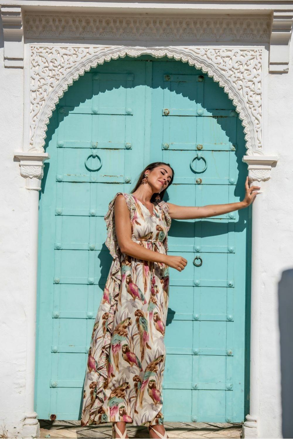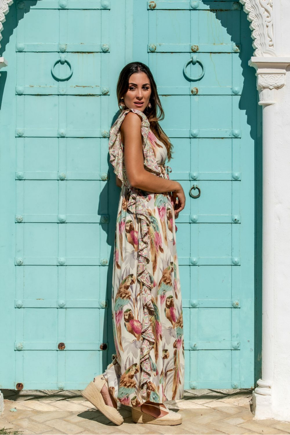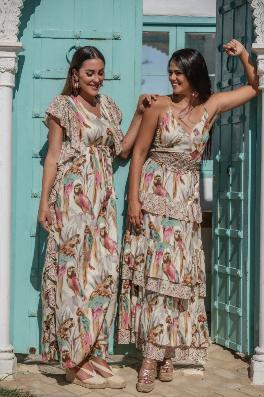 Vestido guacamayo en viscosa túnica estampado crudo con guacamayos en tonos pastel y combinado con estampado haciendo hojas en volantes laterales.