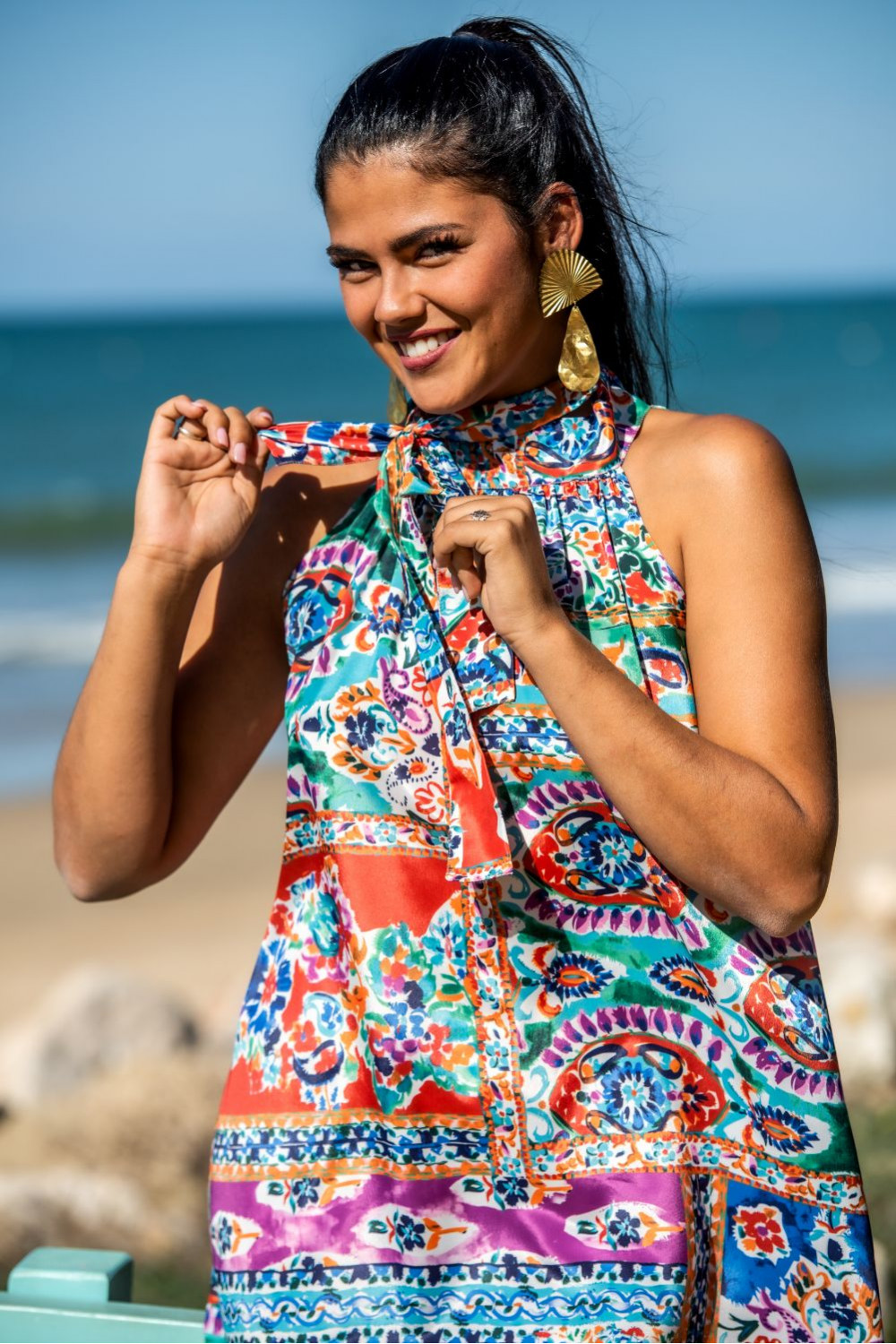 Mono asimetrico con una manga larga acampanada con estampado mosaico en tonos naranja y rosas Sunset & Moon.Calidad: Exterior: 100% Poliéster - Forro:100% Poliéster