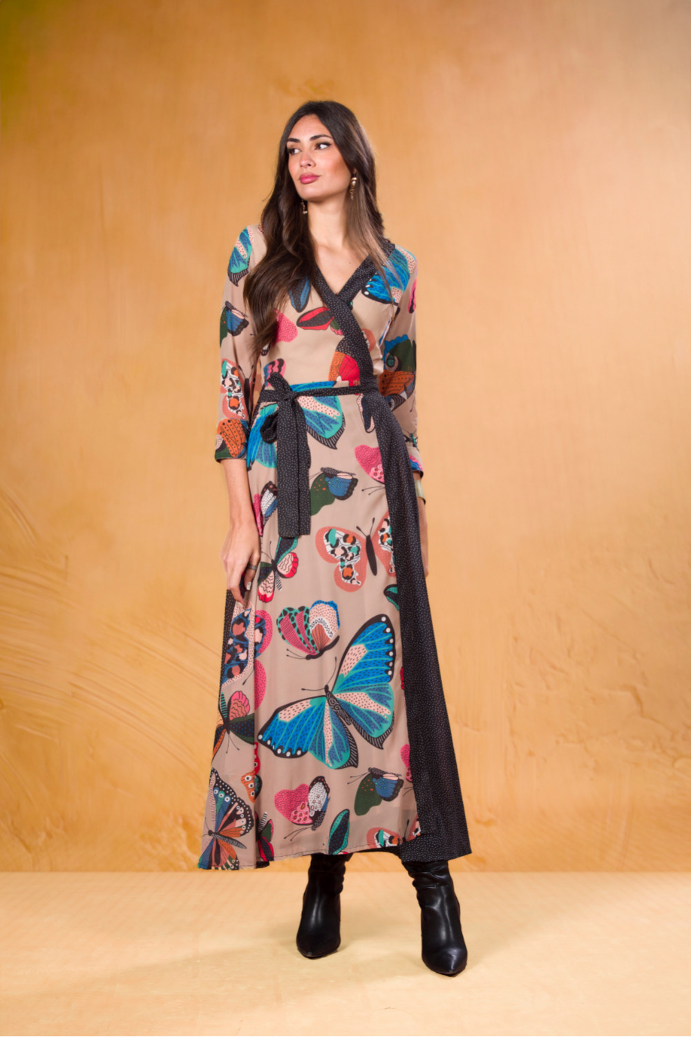 Vestido largo vesta mariposa de colores sobre fondo beige combinando con estampado negro de lunaritos chicos blancos.
