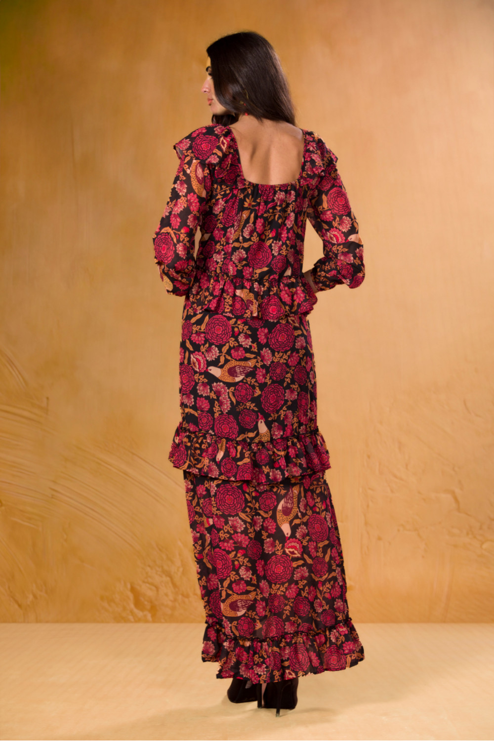 VESTIDO ALGARVE FLORES CORAL DE GASA LARGO CON VOLANTES ASIMETRICOS EN FALDA Y ESCOTE