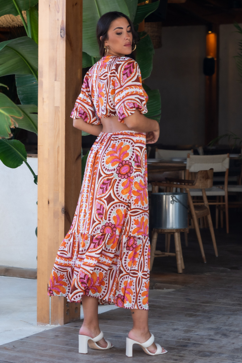 Vestido maxi con aperturas en cintura, mangas abullonadas y gran escote de pico en tonos naranjas y fucsias Sunset & Moon.