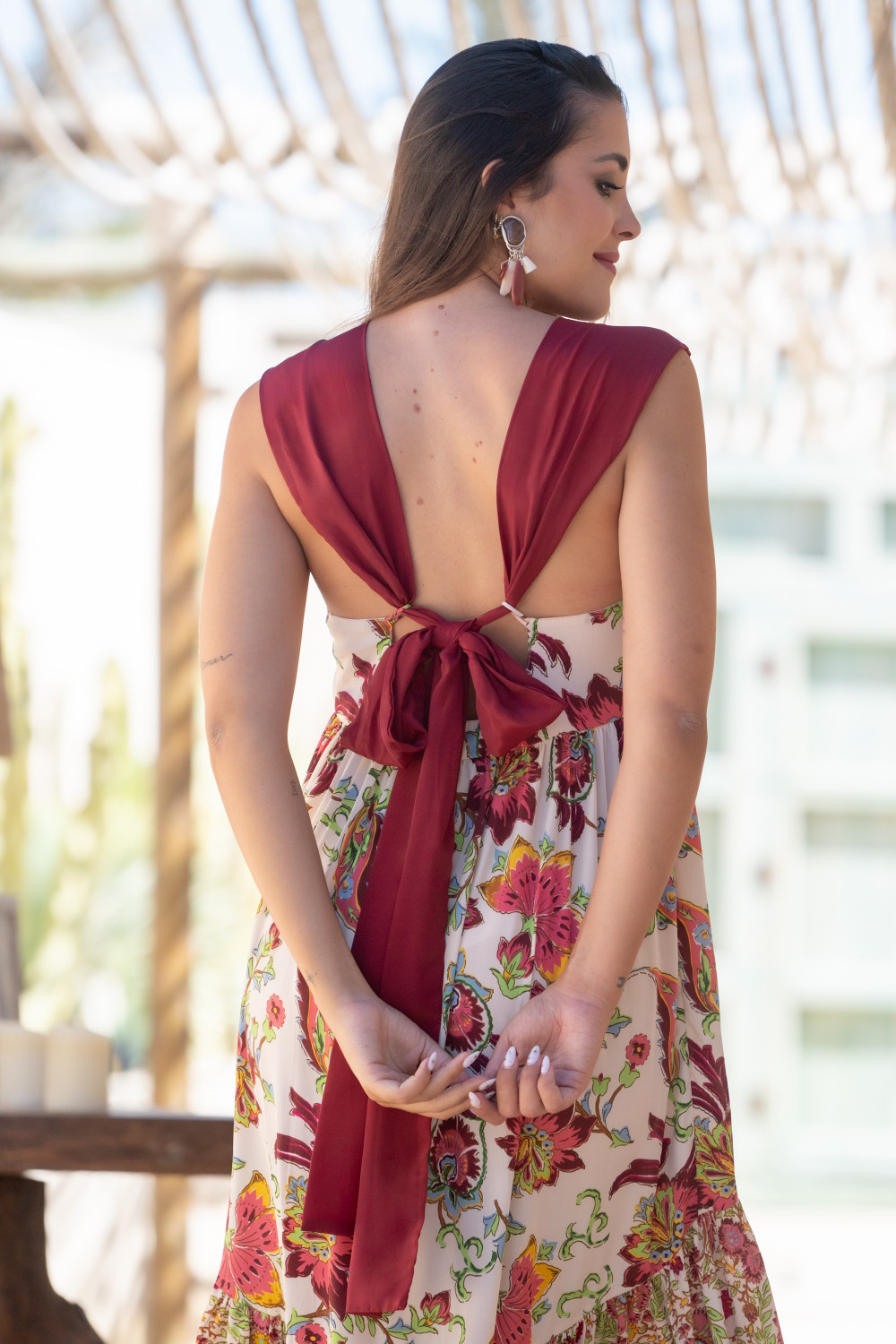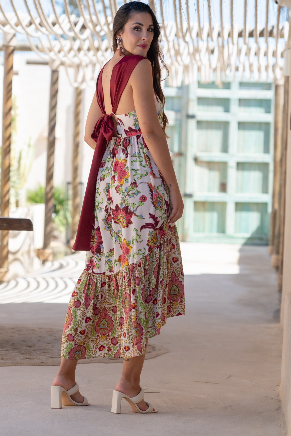 Referencia: PV2491BVestido suelto con largo asimetrico y corte bajo el pecho en polisilk con estampado en tonos granates y verde sobre marfil y tirantas anchas en granate que forman lazada en la espalda Sunset & Moon.