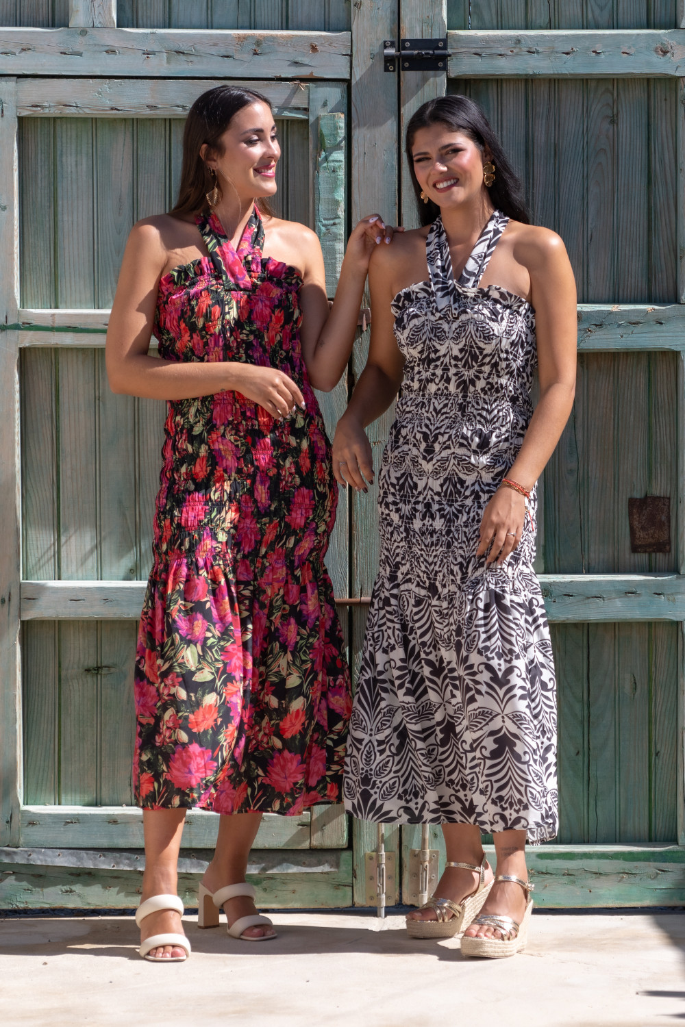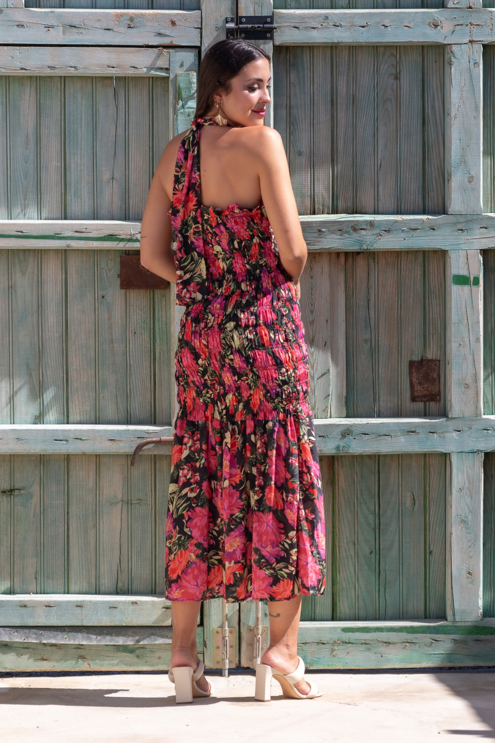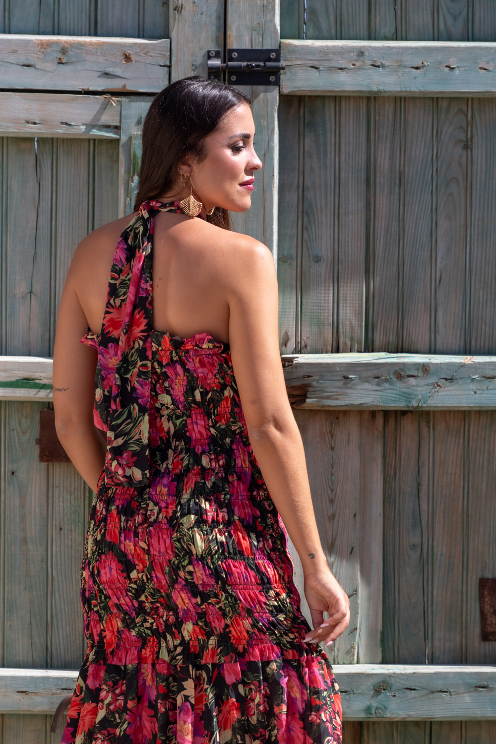 Referencia: PV2493AVestido palabra de honor con cuerpo ajustado de nido de abeja y maxi volante en bajo de polisilk con estampado floral en tonos rojos y fucsias sobre negro Sunset & Moon.