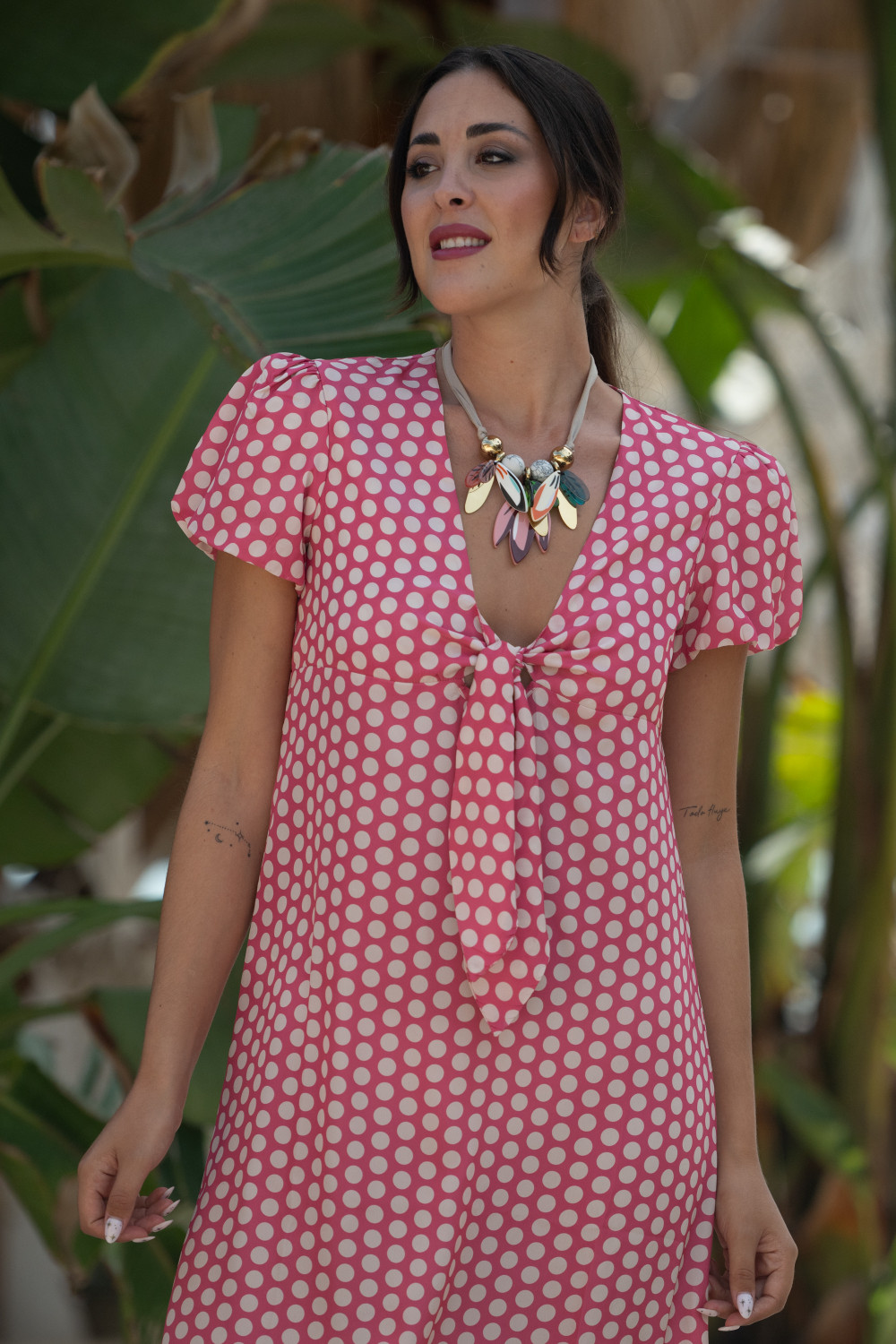 Vestido largo con lazada en el pecho y corte evase en polisilk con estampado de lunares en rosa Sunset & Moon.
