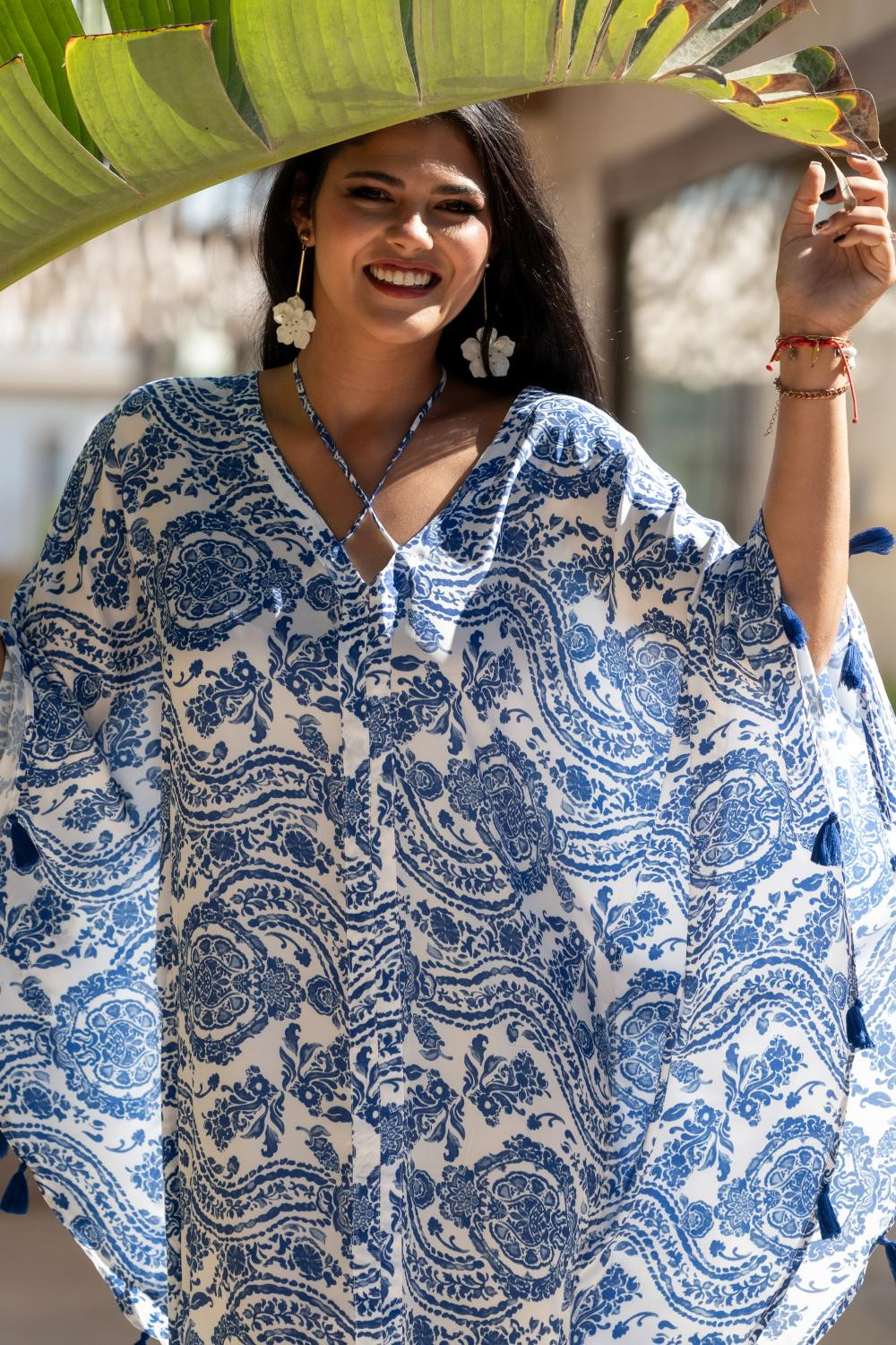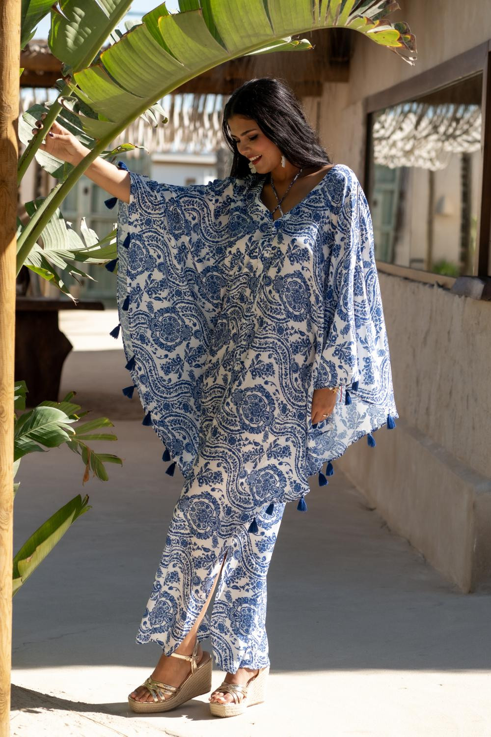 Referencia: PV2498CVestido kaftan con mangas murcielago en polisilk con pompones decorativos. estampado en azul sobre blanco con los pompones en azul Sunset & Moon.