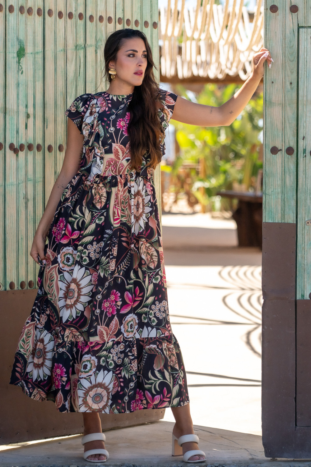 Referencia: PV2499AVestido largo con volante maxi en el bajo corte a la cintura, escote a la caja y espalda descubierta. lleva volantes en la sisa a modo de manga. Tejido polisilk y estampado floral en tonos rosas y beige sobre fondo negro Sunset & Moon.