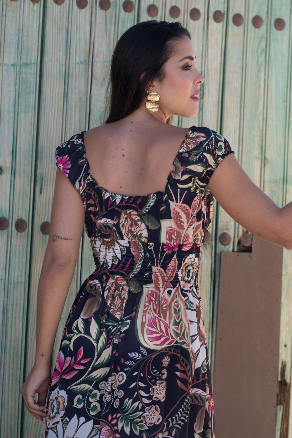 Vestido maxi con 5 volantes en el bajo y escote y mangas adaptables con elastico. cinturilla de nido de abeja. Tejido en polisilk y estampado floral en tonos rosas y beige sobre fondo negro Sunset & Moon.