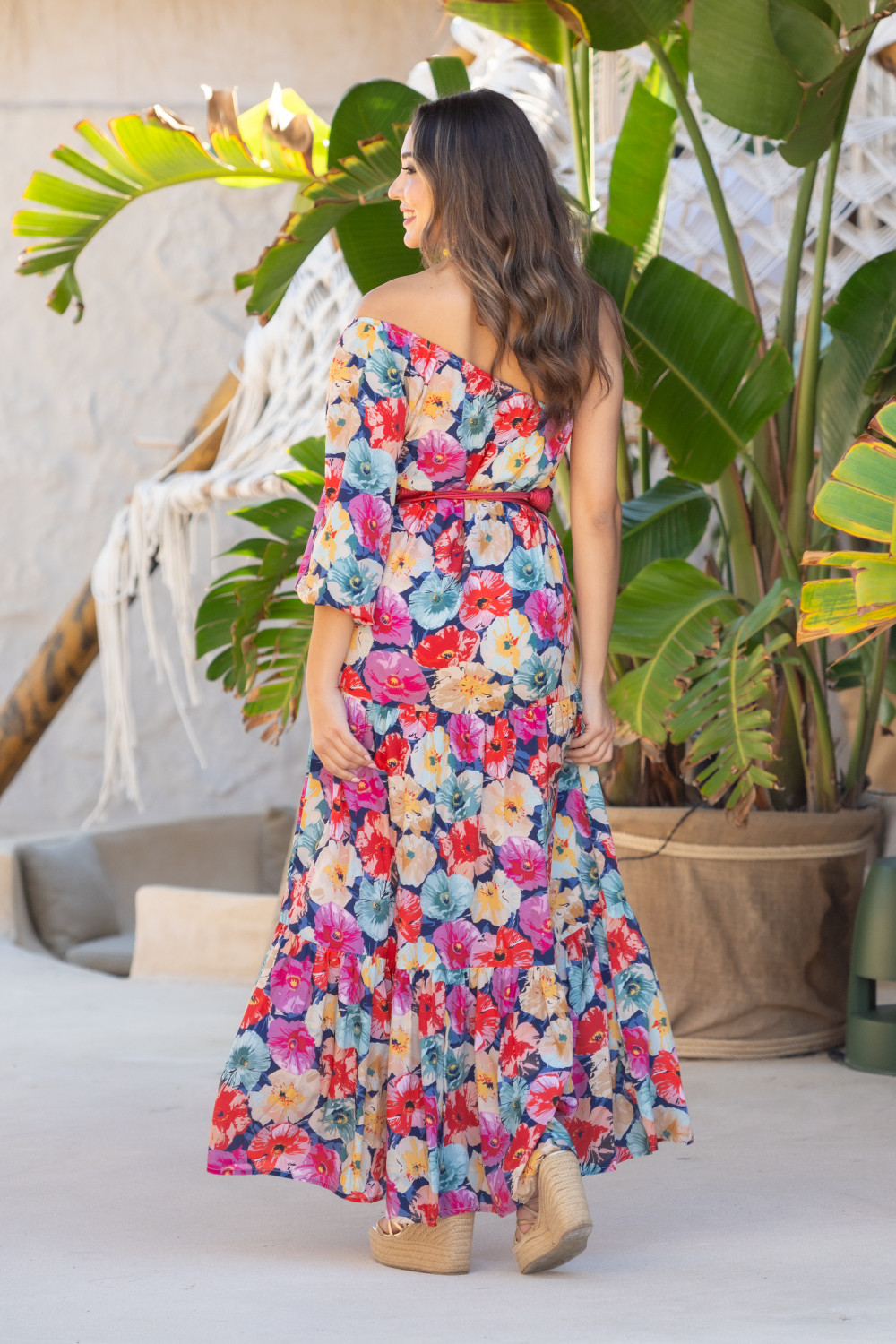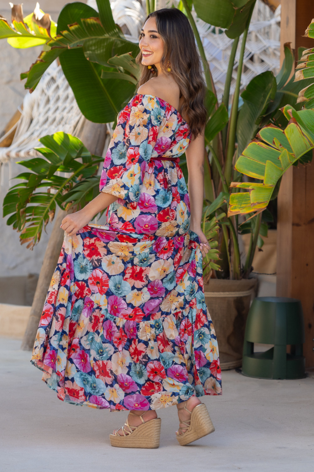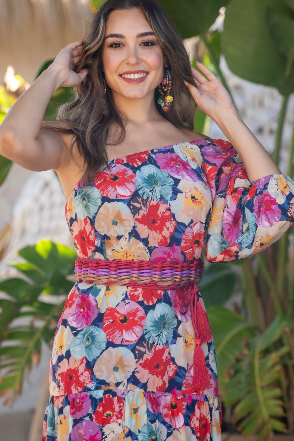 Vestido escote asimetrico y una sola manga globo. Vestido largo y cuerpo de volantes con cinturon independiente. Tejido en polisilk y estampaso de flores en tonos rosa, azul y amarillo con el cinturon a juego Sunset & Moon.