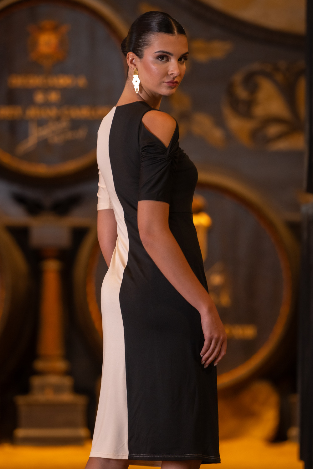 Vestido dry bicolor blanco y negro en punto de seda con manga corta y nudo en la manga y el escote.