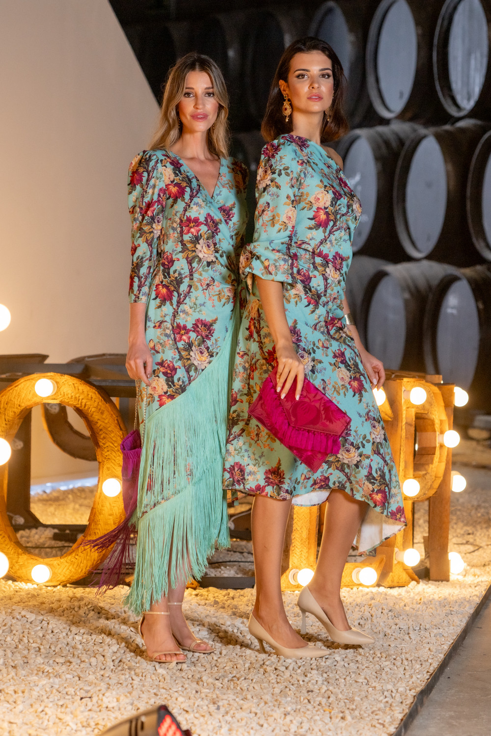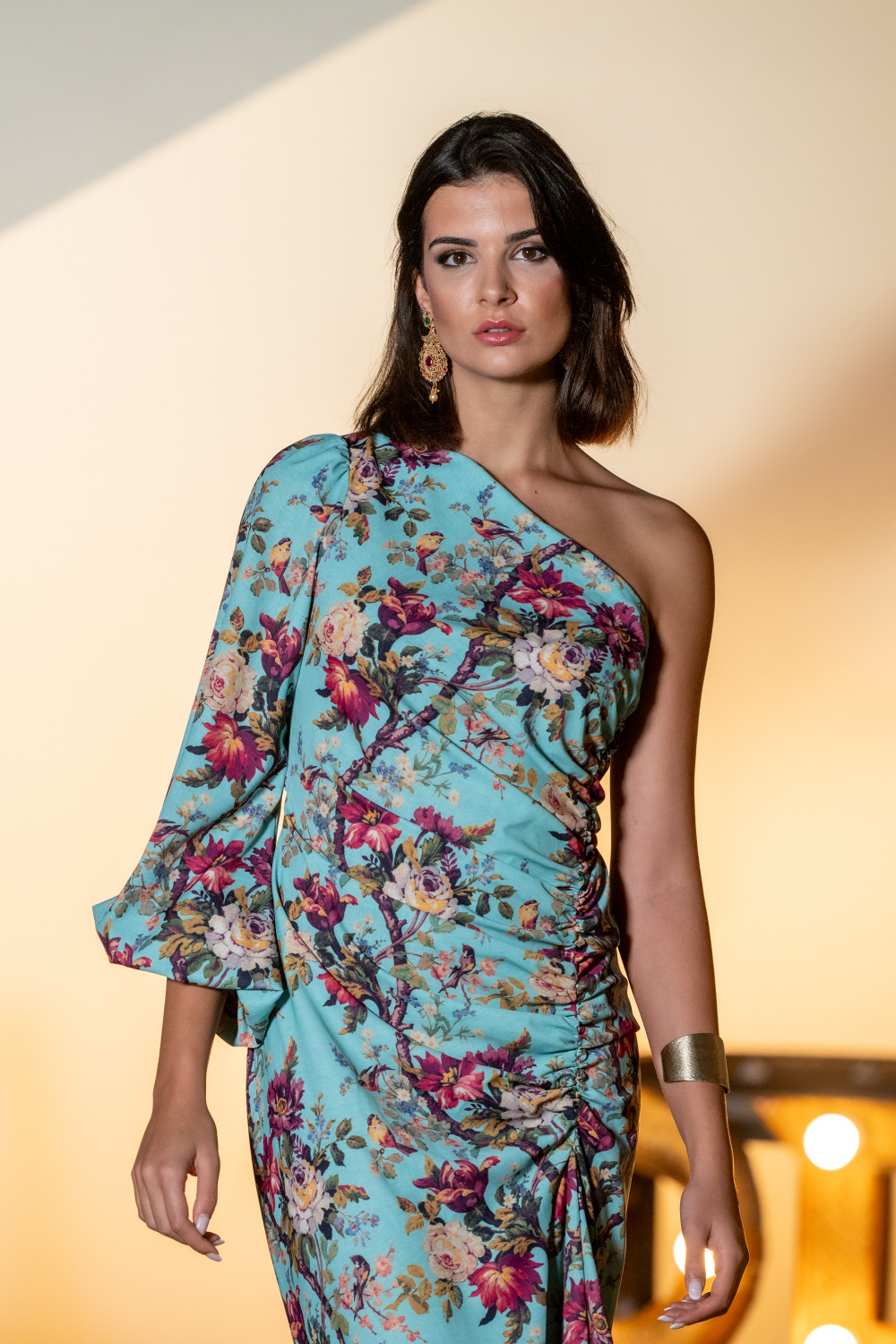 Vestido arrope turquesa estampado en tonos turquesa ramos de flores en tonos beige rosas y amarillo, asimétrico con una manga drapeado en el costado.