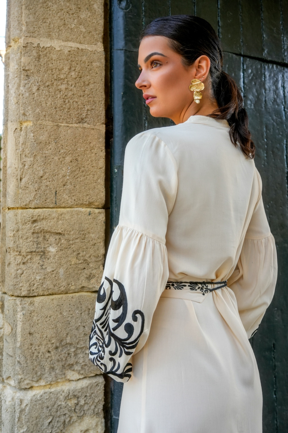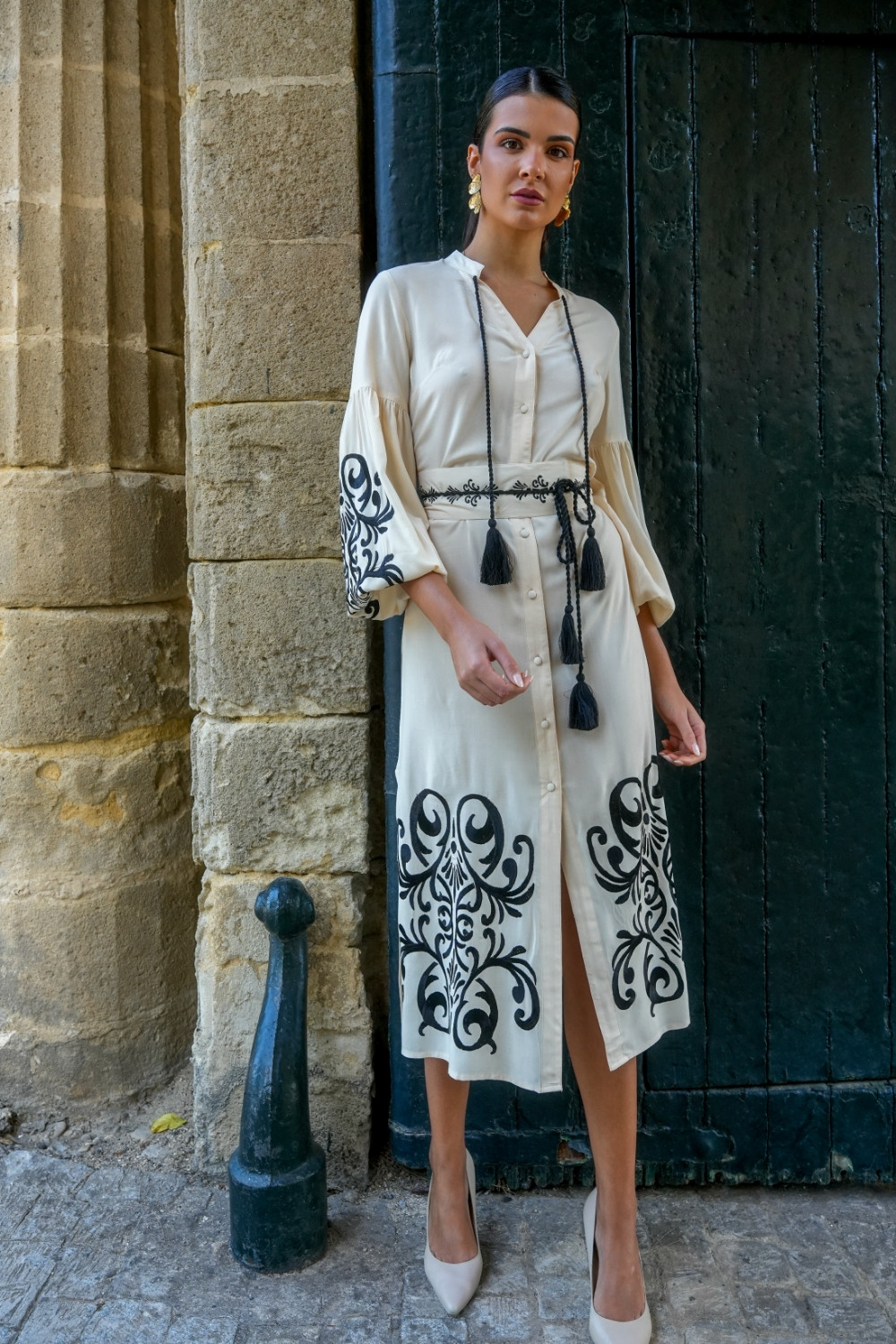 Referencia: V2460BVestido destino beige camisero de algodón bordado en negro con motivos etnicos y manga larga globo kahyra.