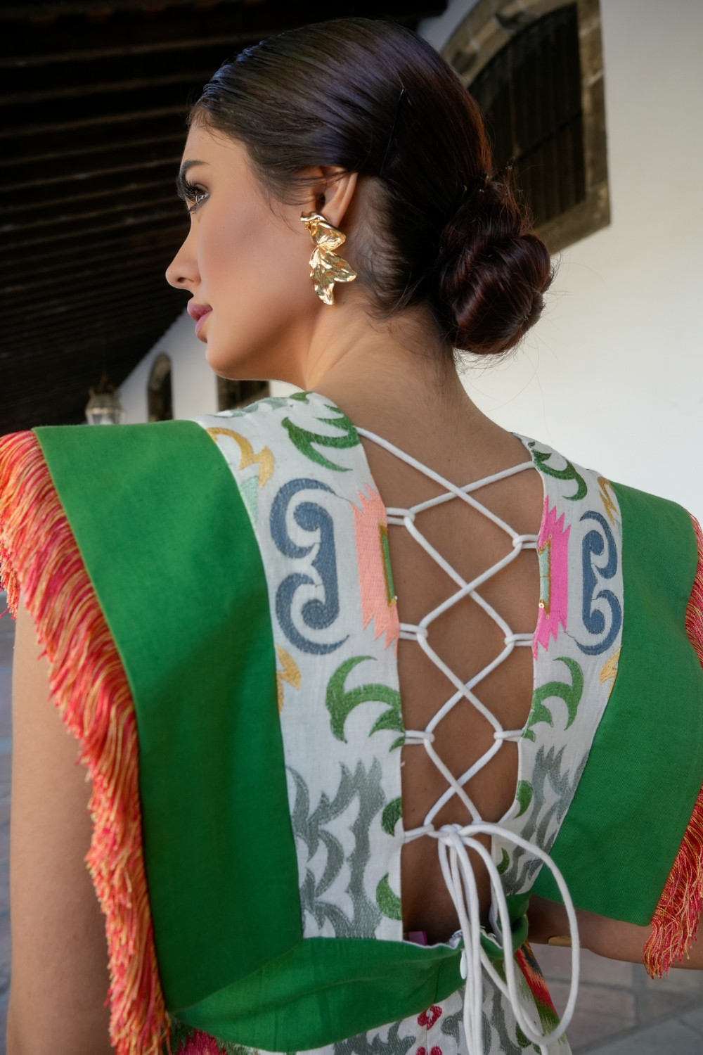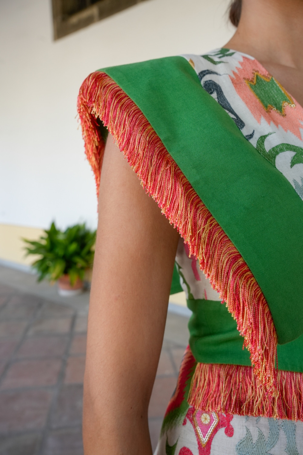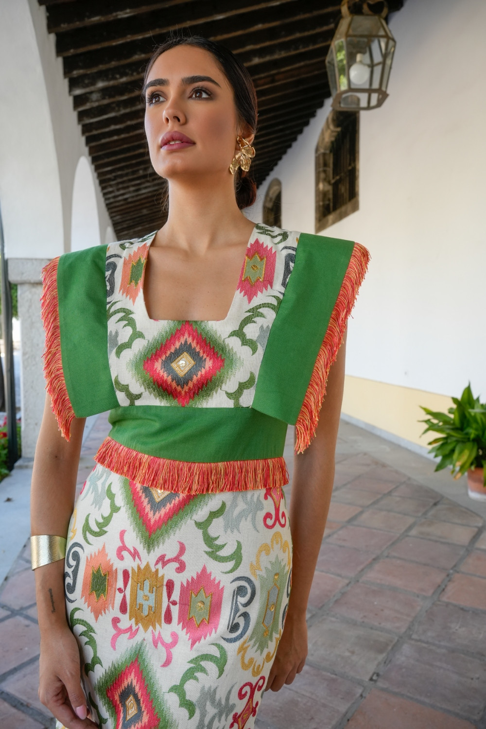 Vestido Mariposa Beige tejido bordado étnico multicolor, con alas lisas verde y cintura, con flecado multi , escote cuadrado en pecho y espalda. Espalda con detalle de cruceta .Káhyra