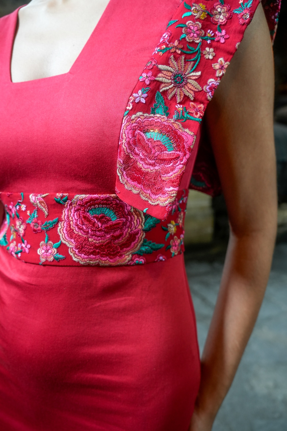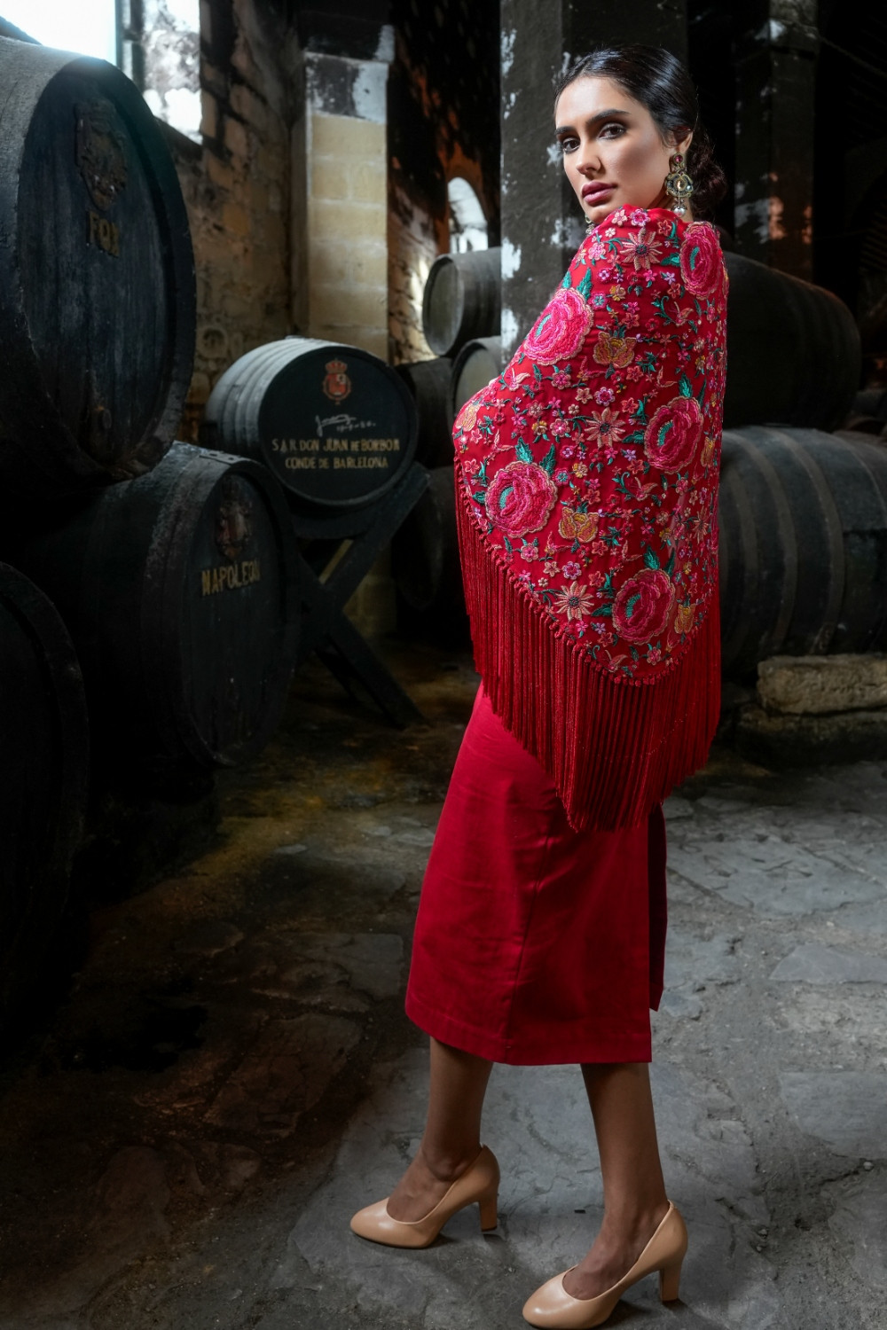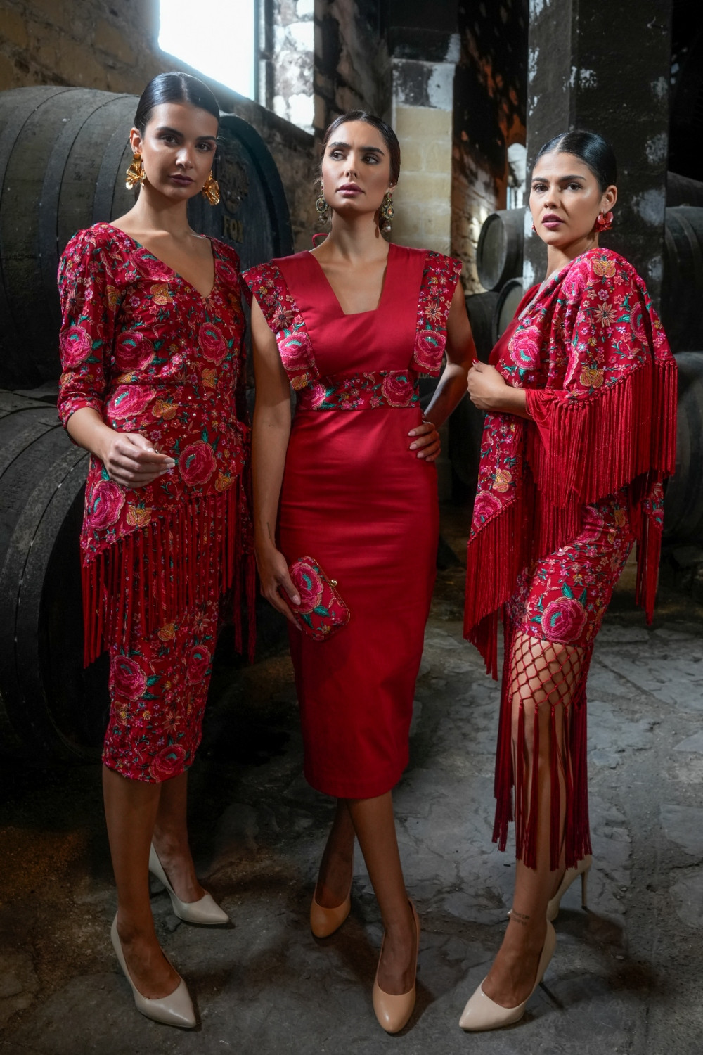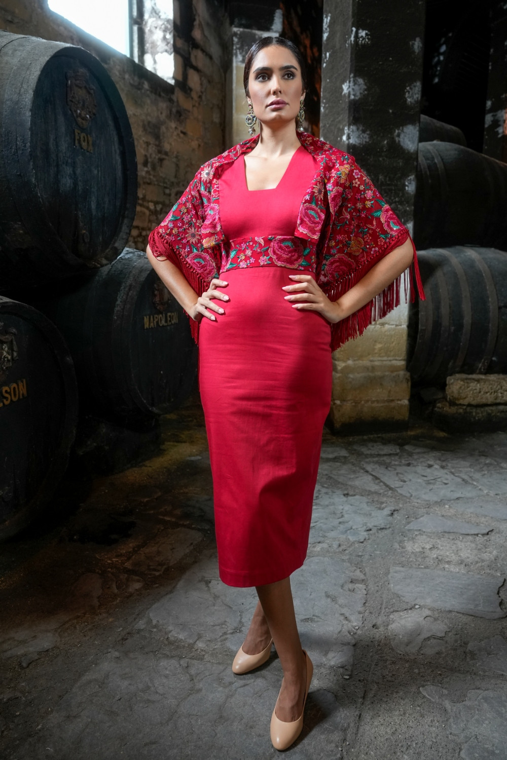 Referencia: V2630CVestido Mariposa Feria rojo alas y cintura en tejido bordado étnico con flecado multi , escote cuadrado en pecho y espalda. Espalda con detalle de cruceta .Káhyra.