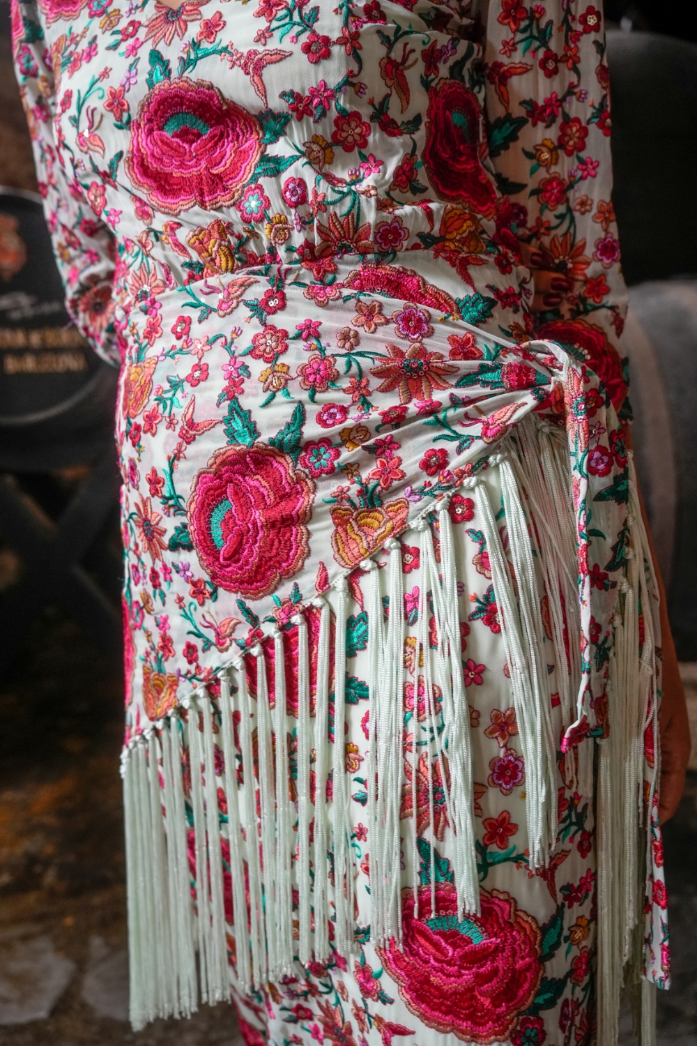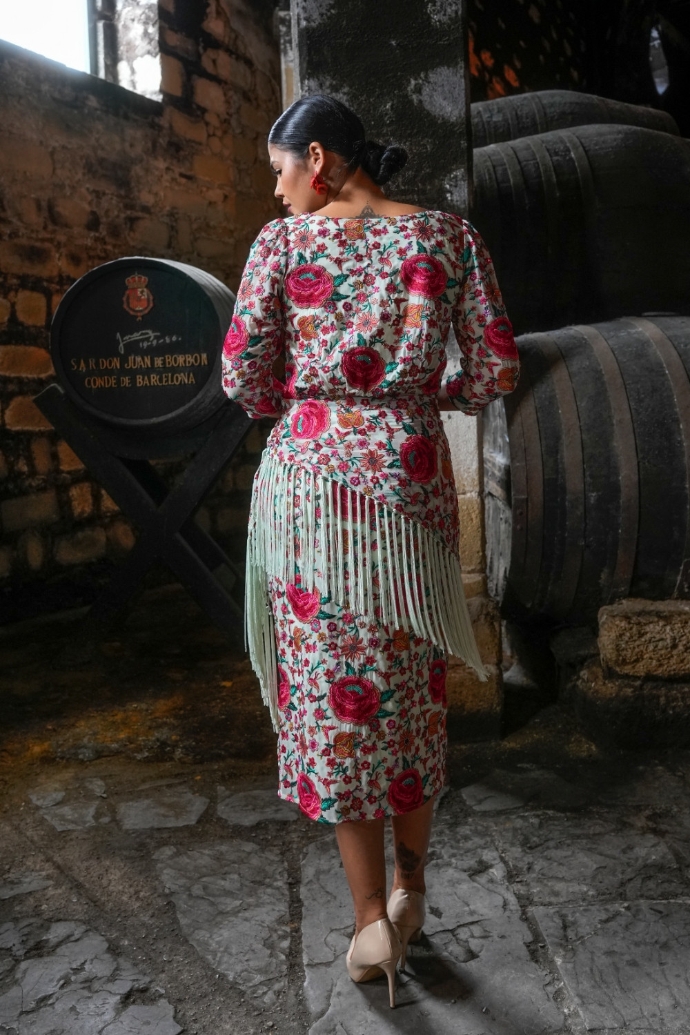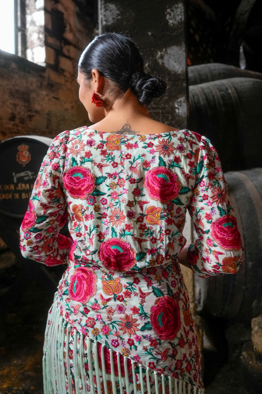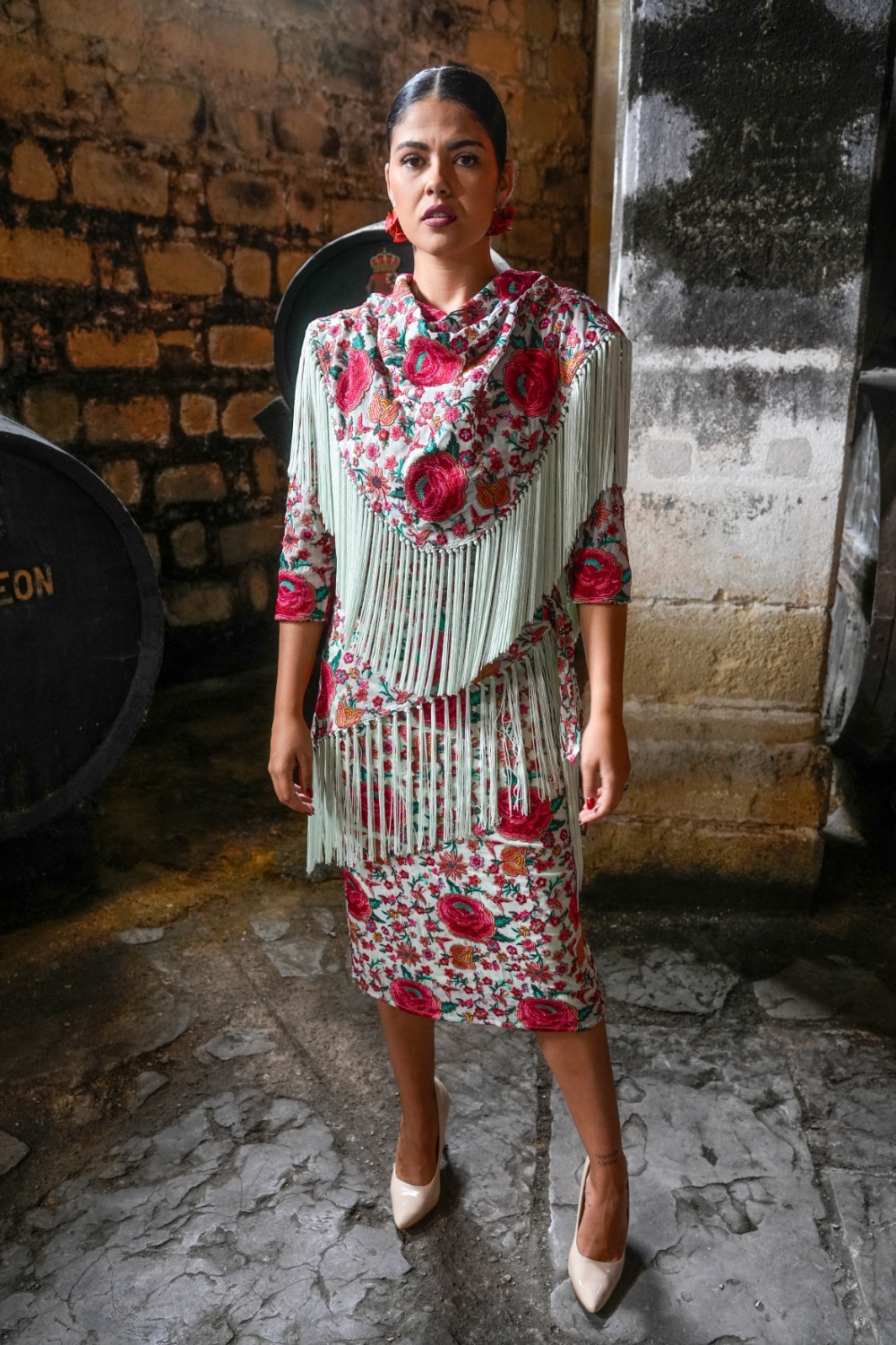 Vestido Feria verde de tejido de gasa bordado con flores en tonos rojo, fucsia y coral de media manga, escote en v y fajín mantoncillo anudado en la cintura Káhyra.