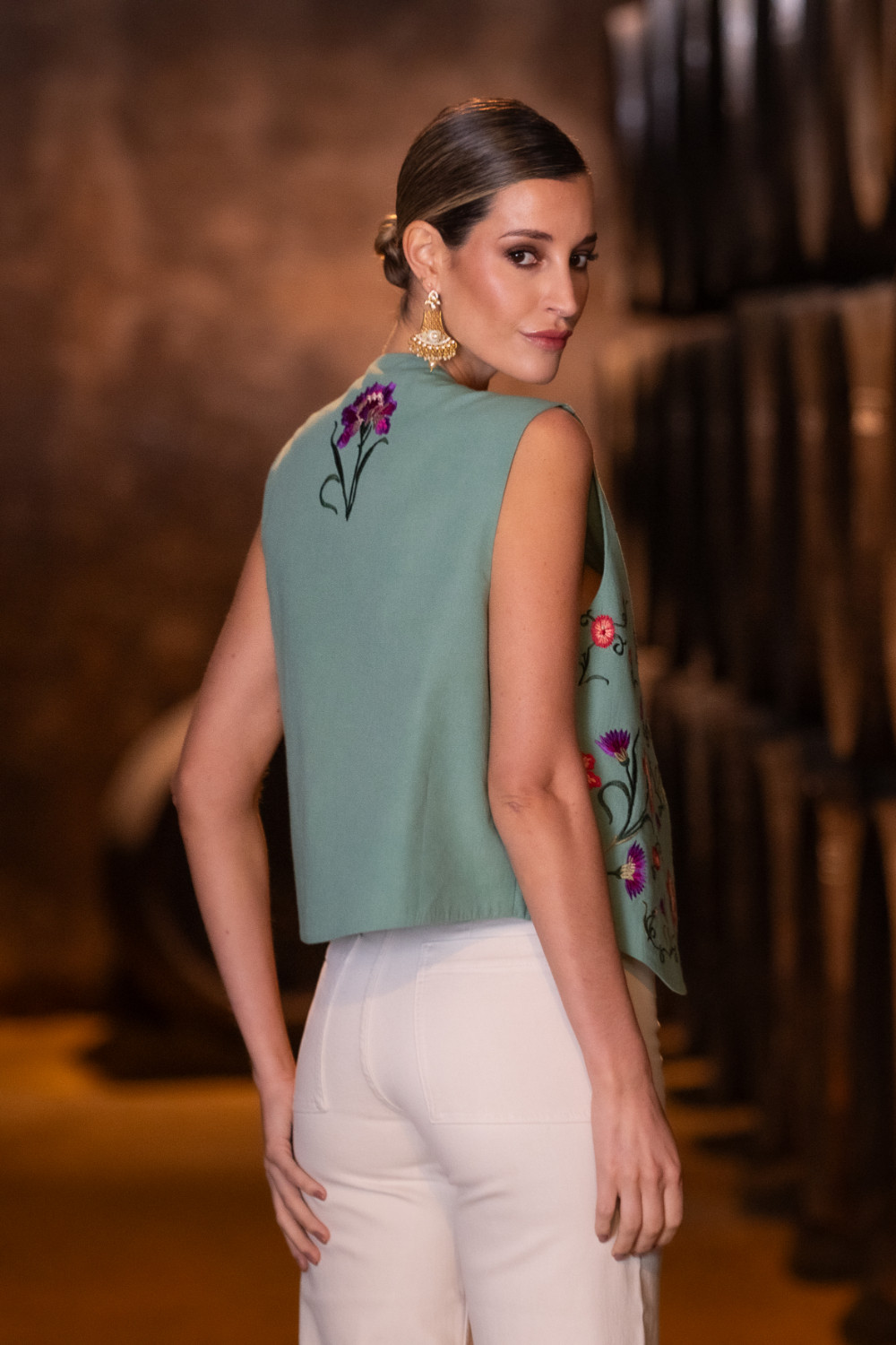 Top beige liso gasa con escote corazón y mangas abullonadas.