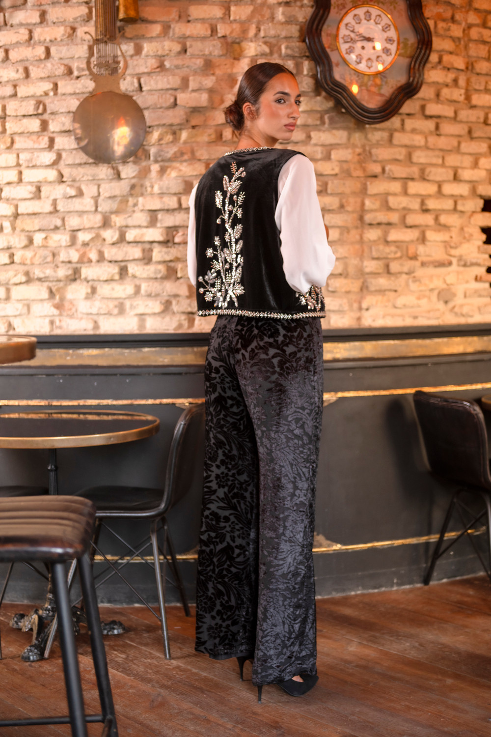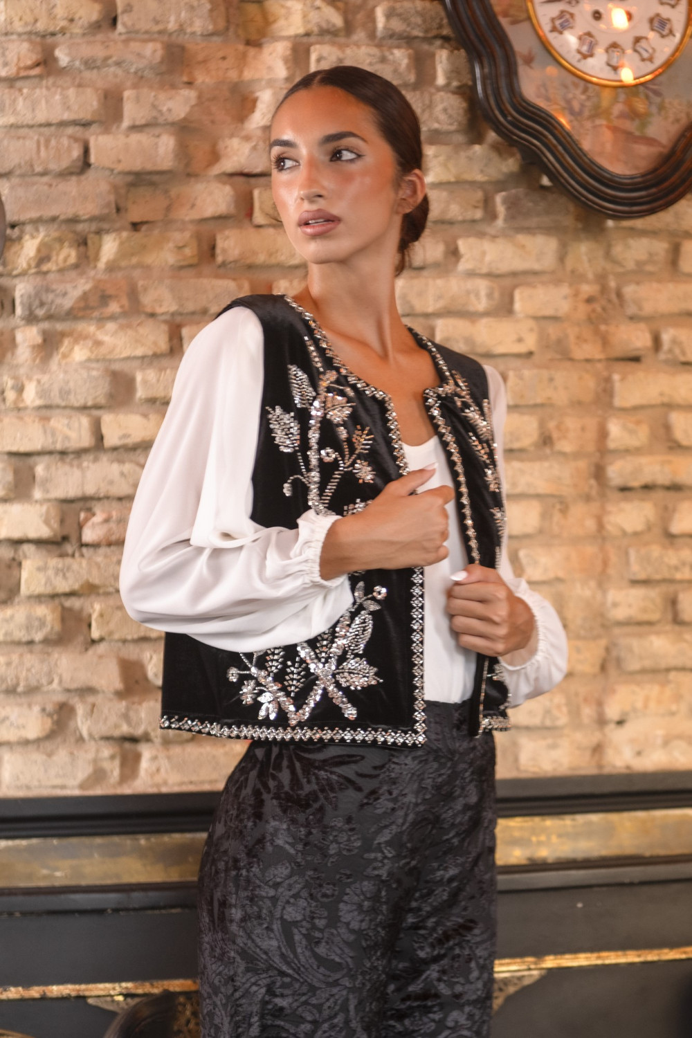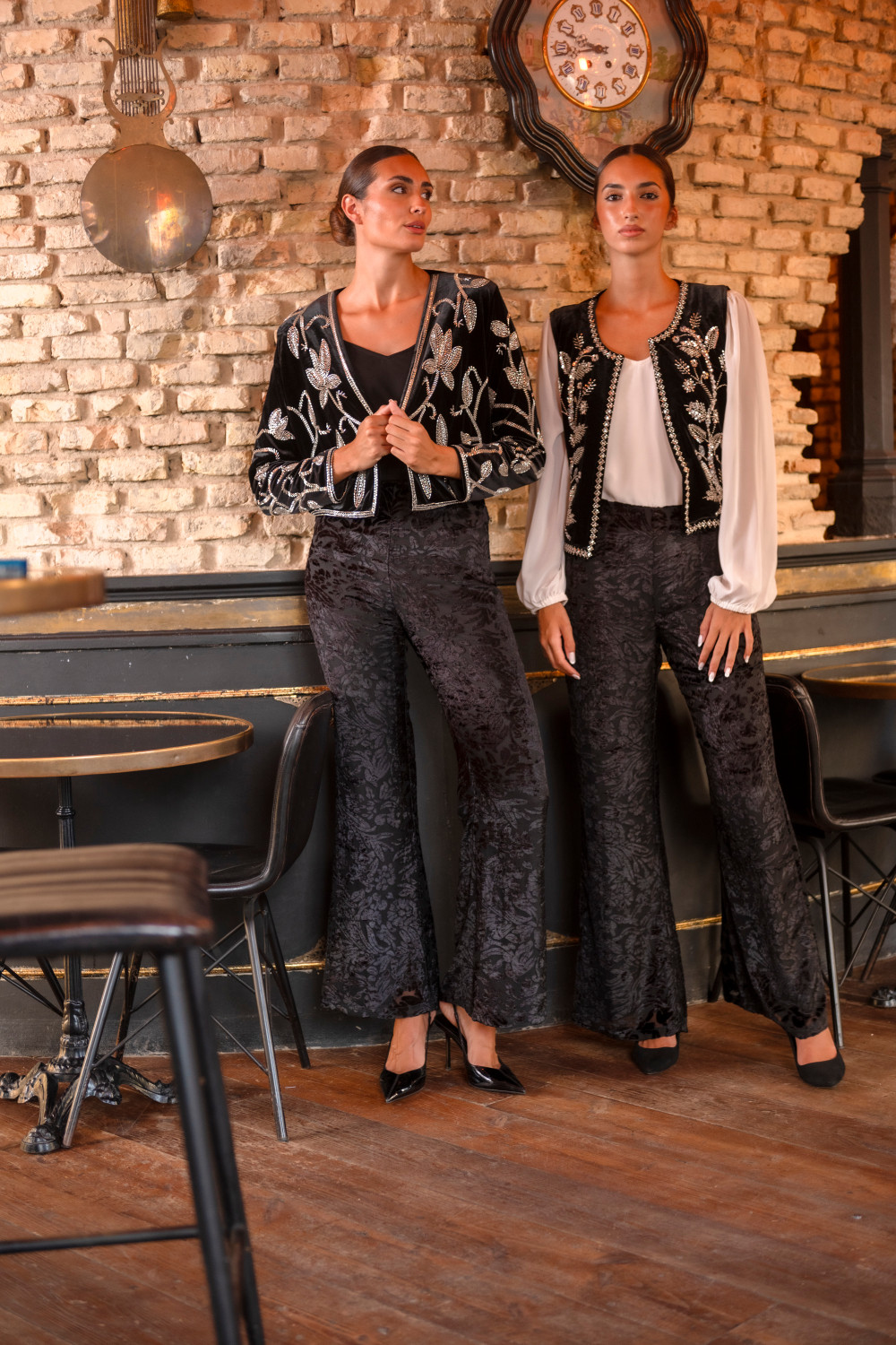 Chaleco Romero de terciopelo negro con apliques de pedrería plata CALIDAD: 92 % POLYESTER 8 % SPANDEX