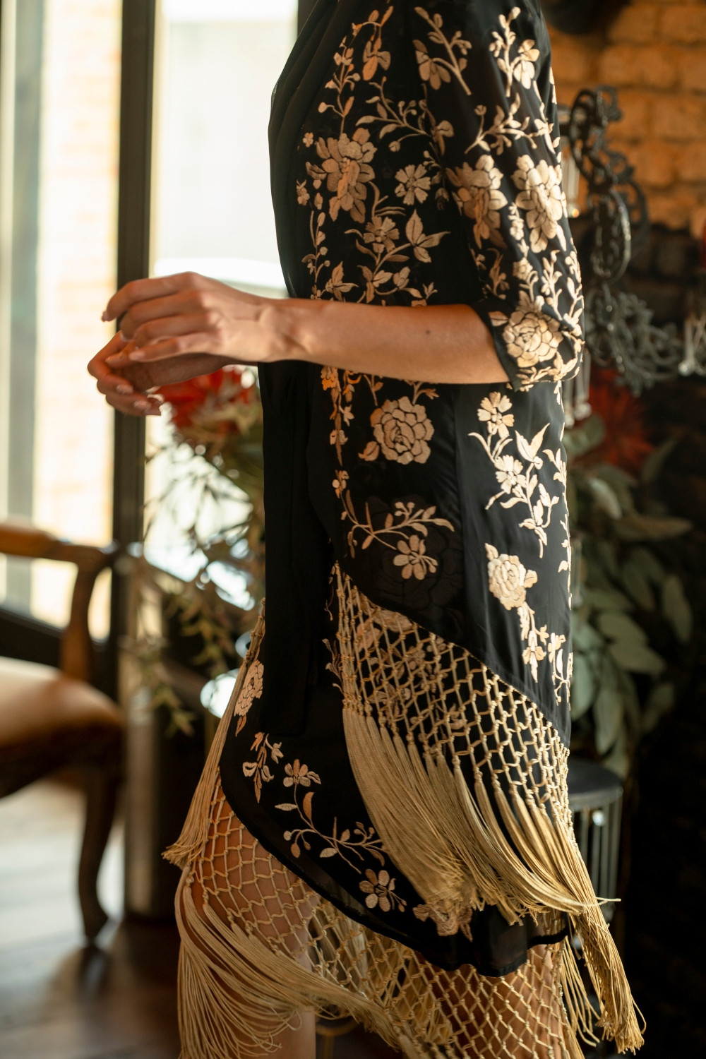 Chaqueta Jazmín negra de gasa con manga francesa, atado en la cintura y bordado en beige dorado terminado en el bajo asimetrico con flecos de mantón al tono del bordado Kháyra. COMPOSICIÓN: 100% POLIÉSTER ACCESORIOS: FLECOS 100% VISCOSA