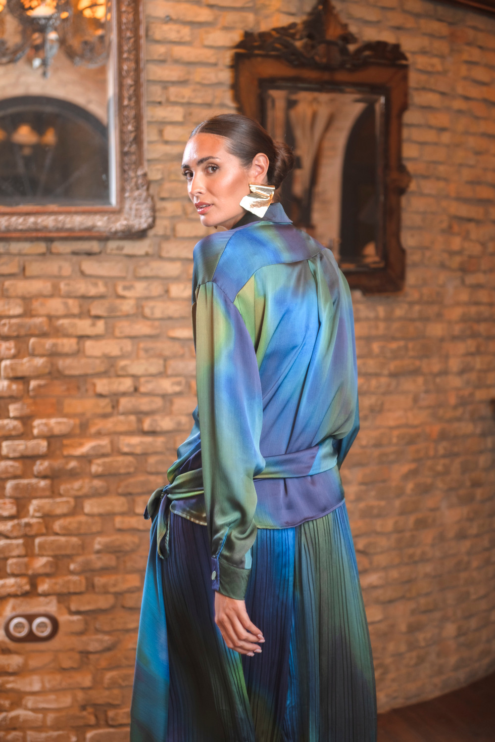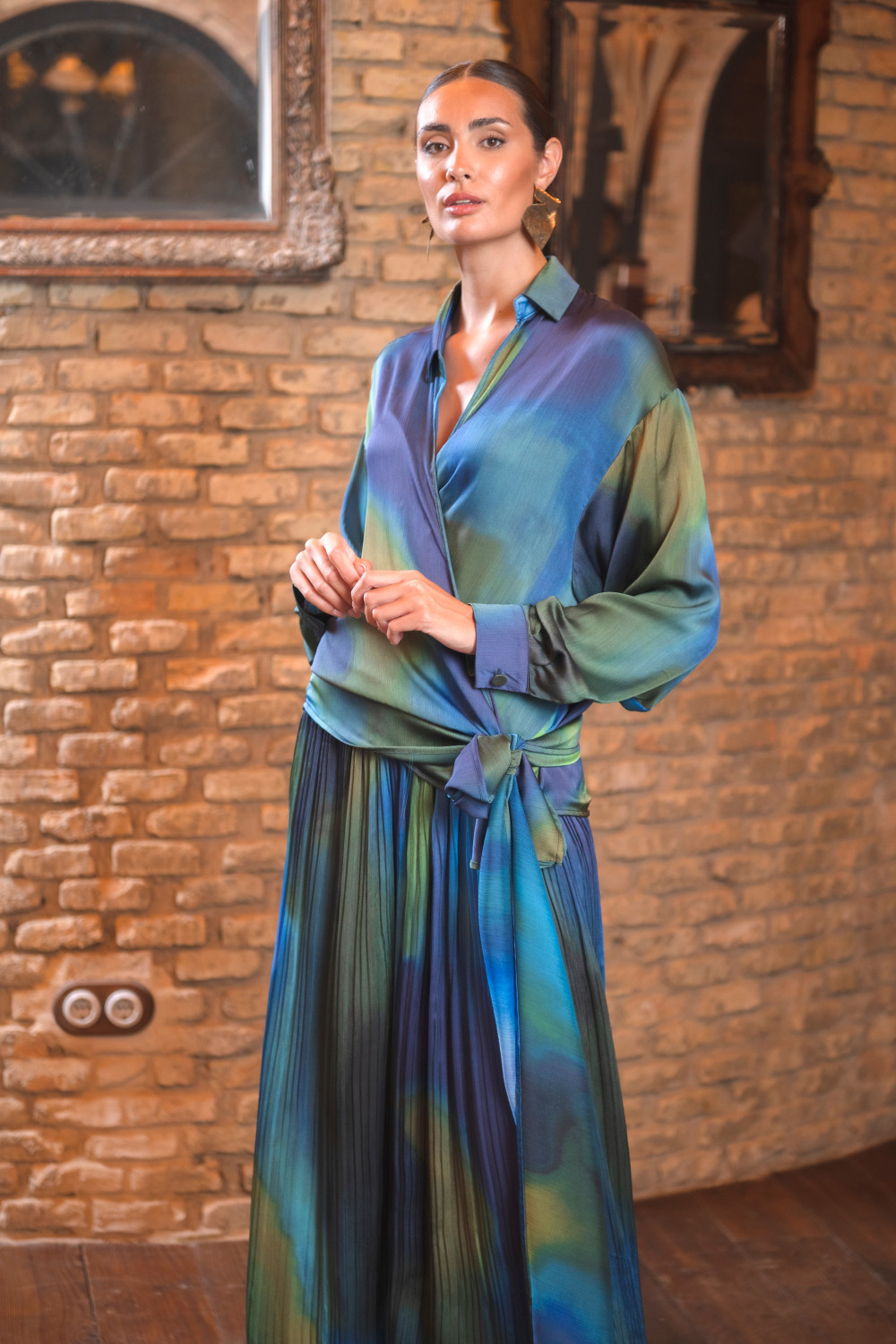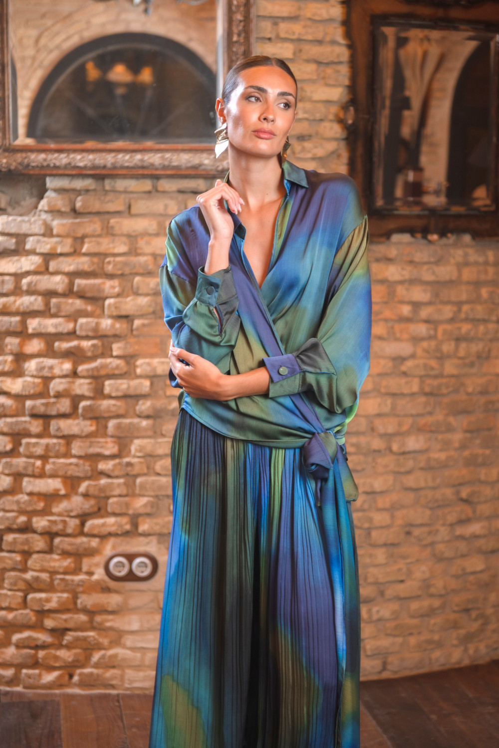 Conjunto 2 piezas Jengibre polisilk top cruzado con cuellos camisero y pantalón plisado largo midi en degrade verde y azul CALIDAD: 100 % POLYESTER