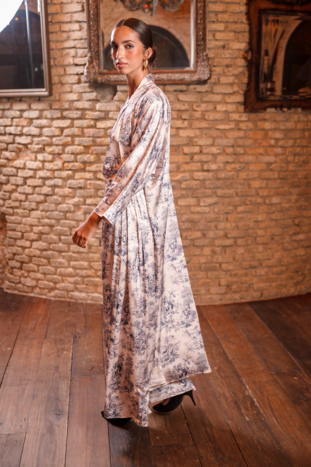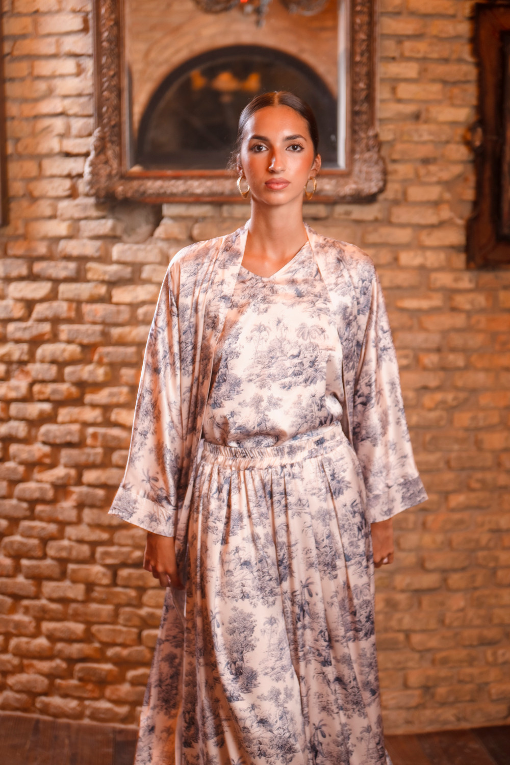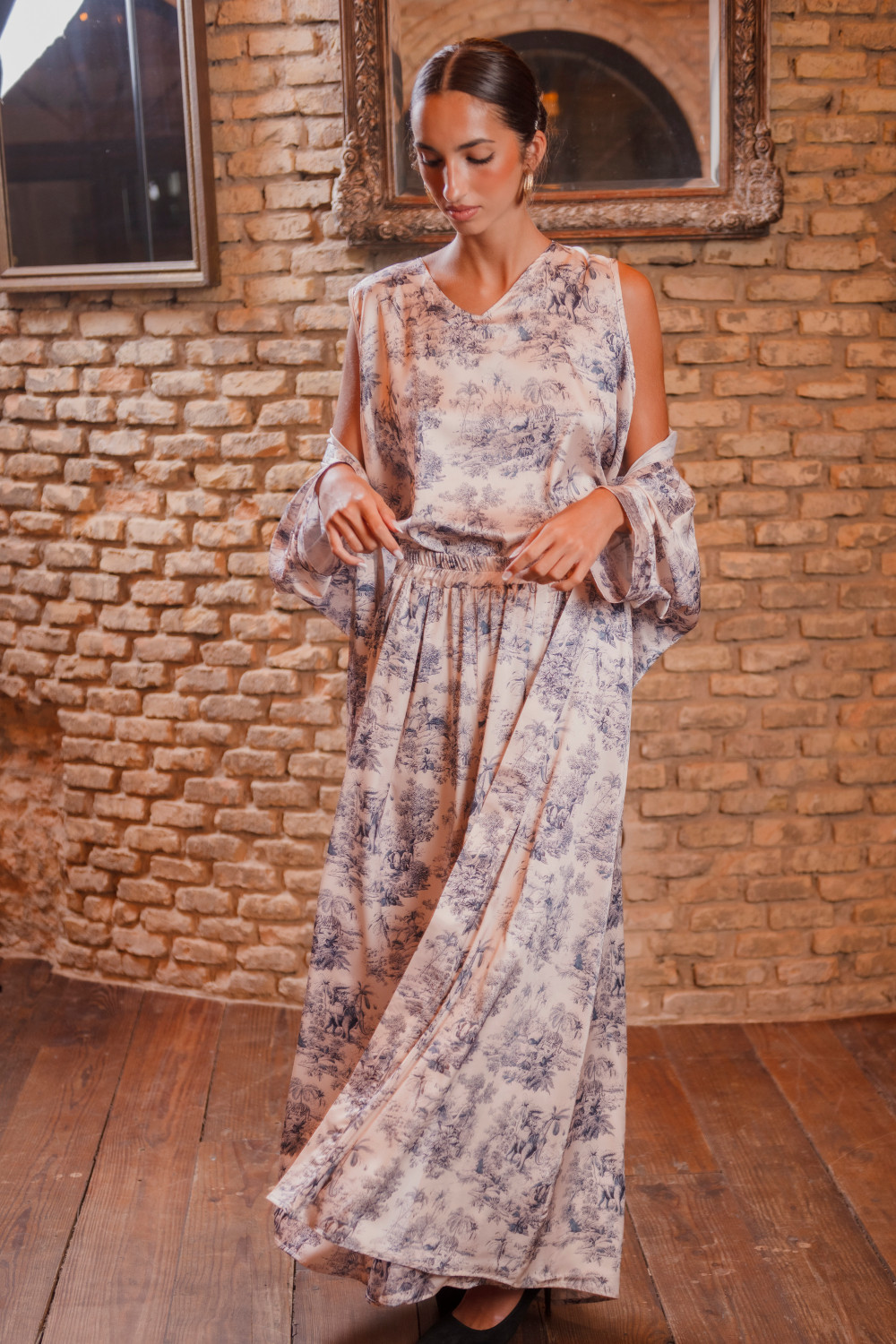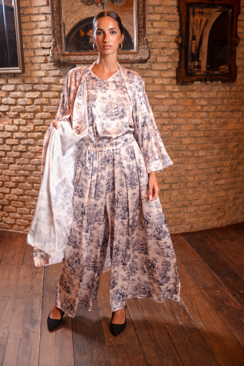 Conjunto 3 piezas kurta. pantalón y top polisilk estampado de fondo beige con estampado monocolor azul de árboles palmera y elefante CALIDAD: 100 % POLYESTER