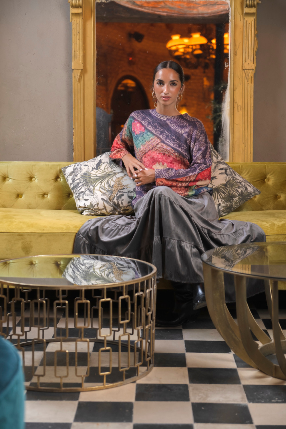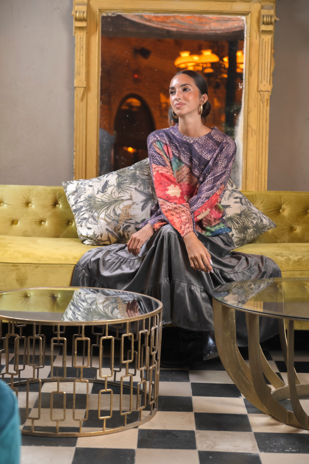 Top rojo liso gasa con escote corazón y mangas abullonadas.