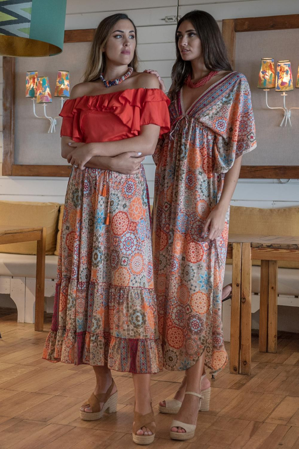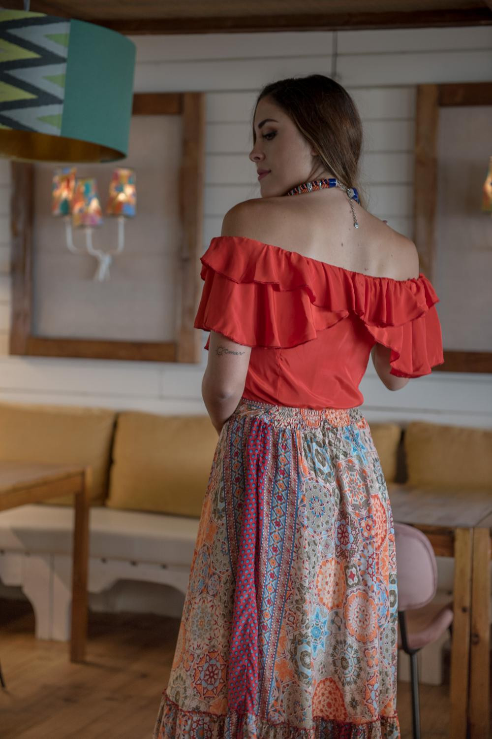 Top escote barco coral sin mangas con doble volante adornando el escote y formando la manga