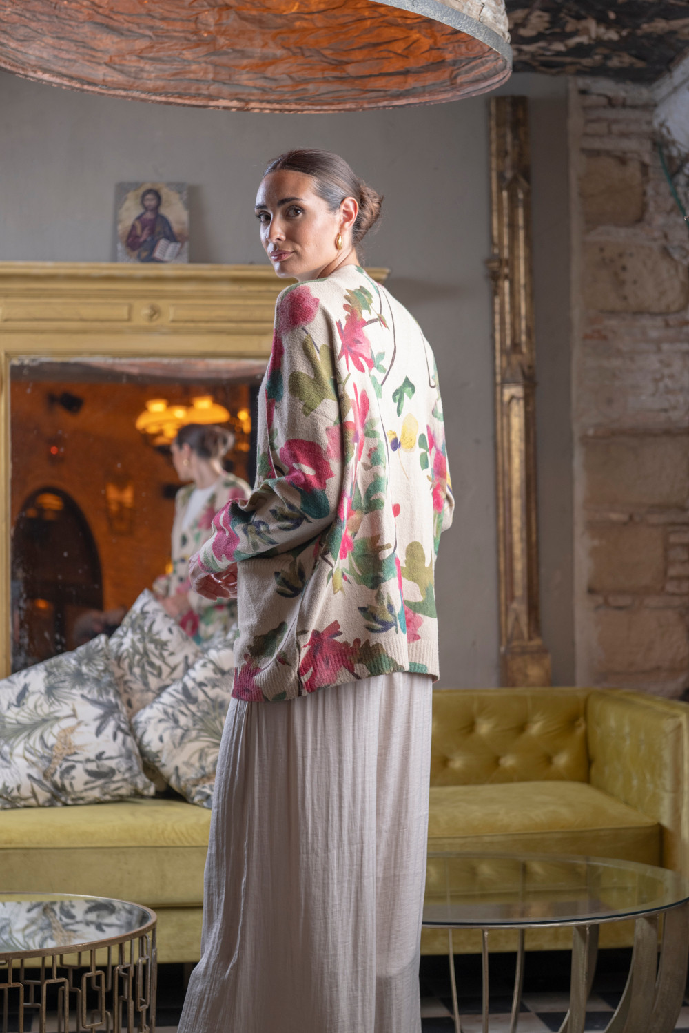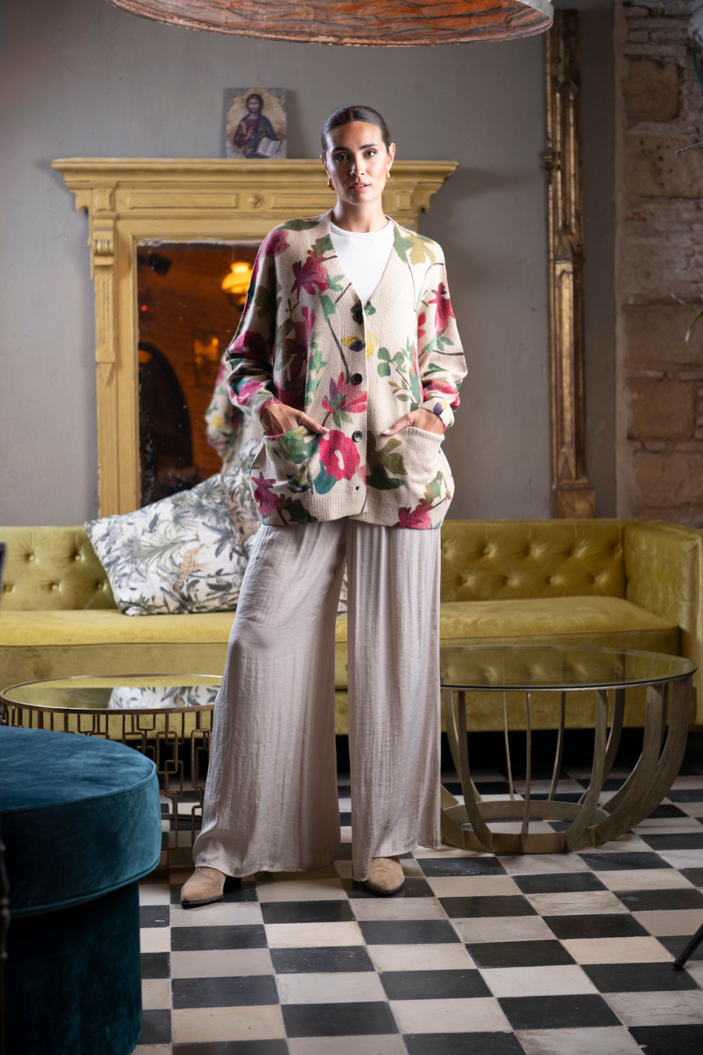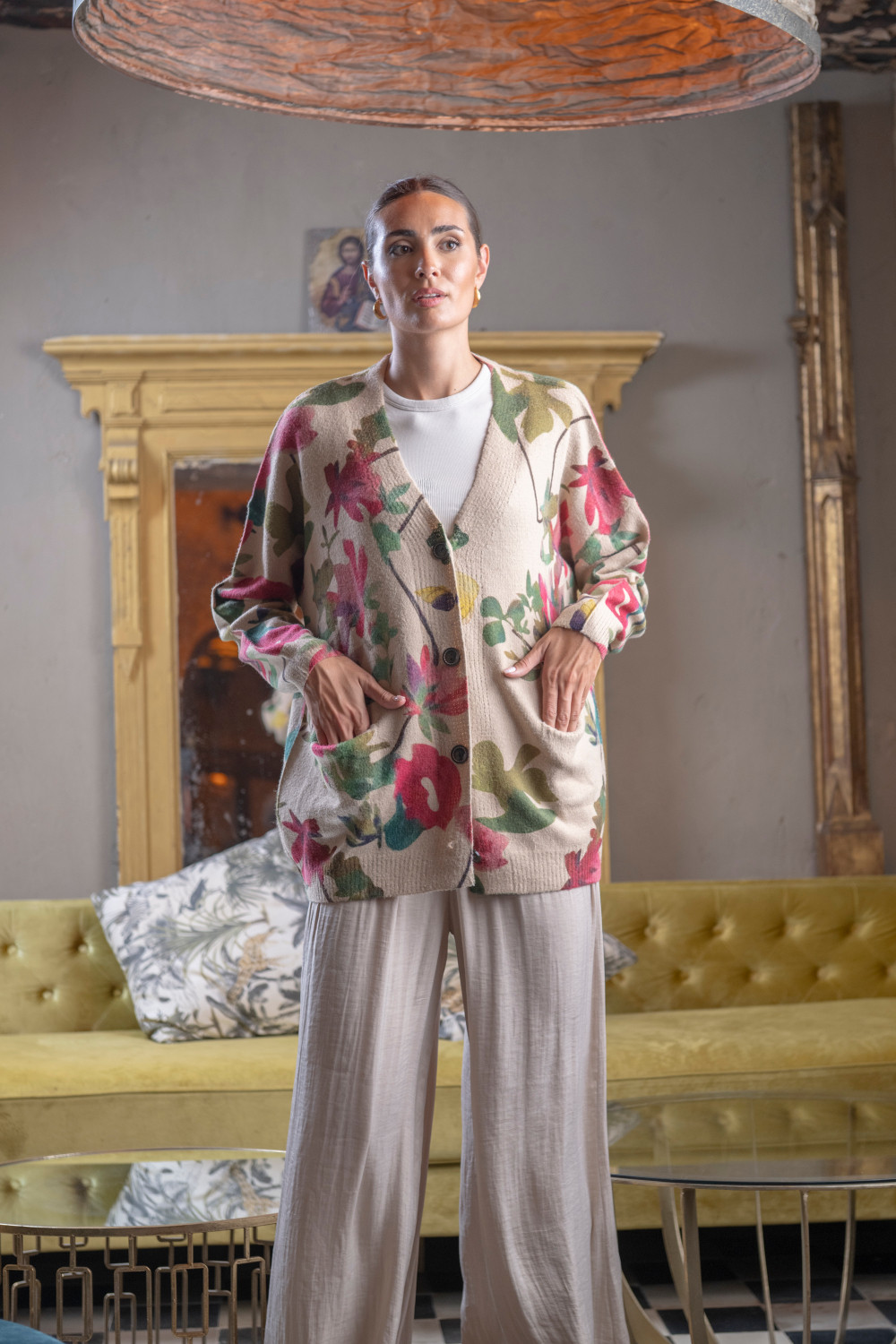 Jersey curry abotonado con bolsillos de fondo taupe y flores fucsias CALIDAD: 100 % POLYESTER