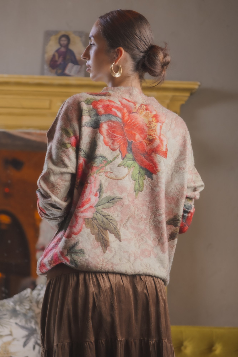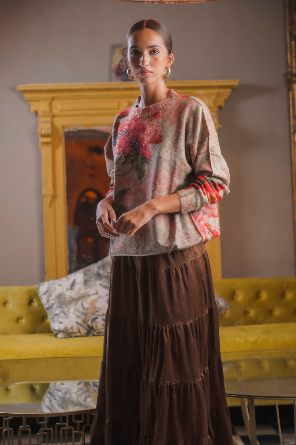Jersey tomillo strass con fondo taupe con flores cuello a la caja CALIDAD: 100 % POLYESTER