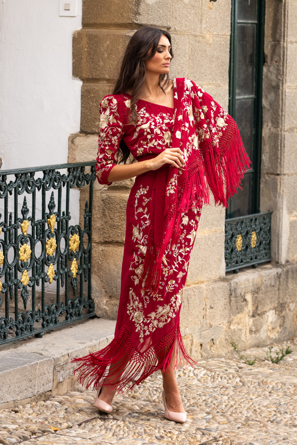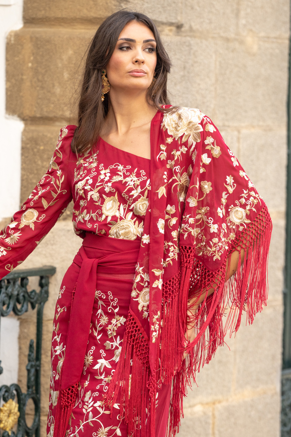 Mantoncillo rojo pico bordado mantón en tonos beige con flores y pájaros, enrejado con flecos beige. Calidad: 100% Poliéster - Flecos: 100% Poliéster