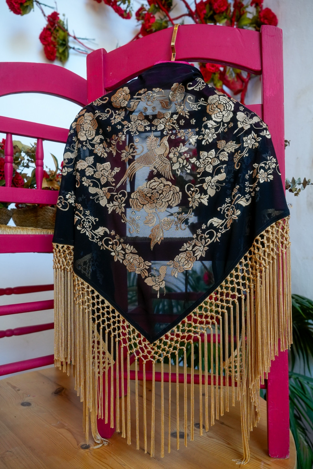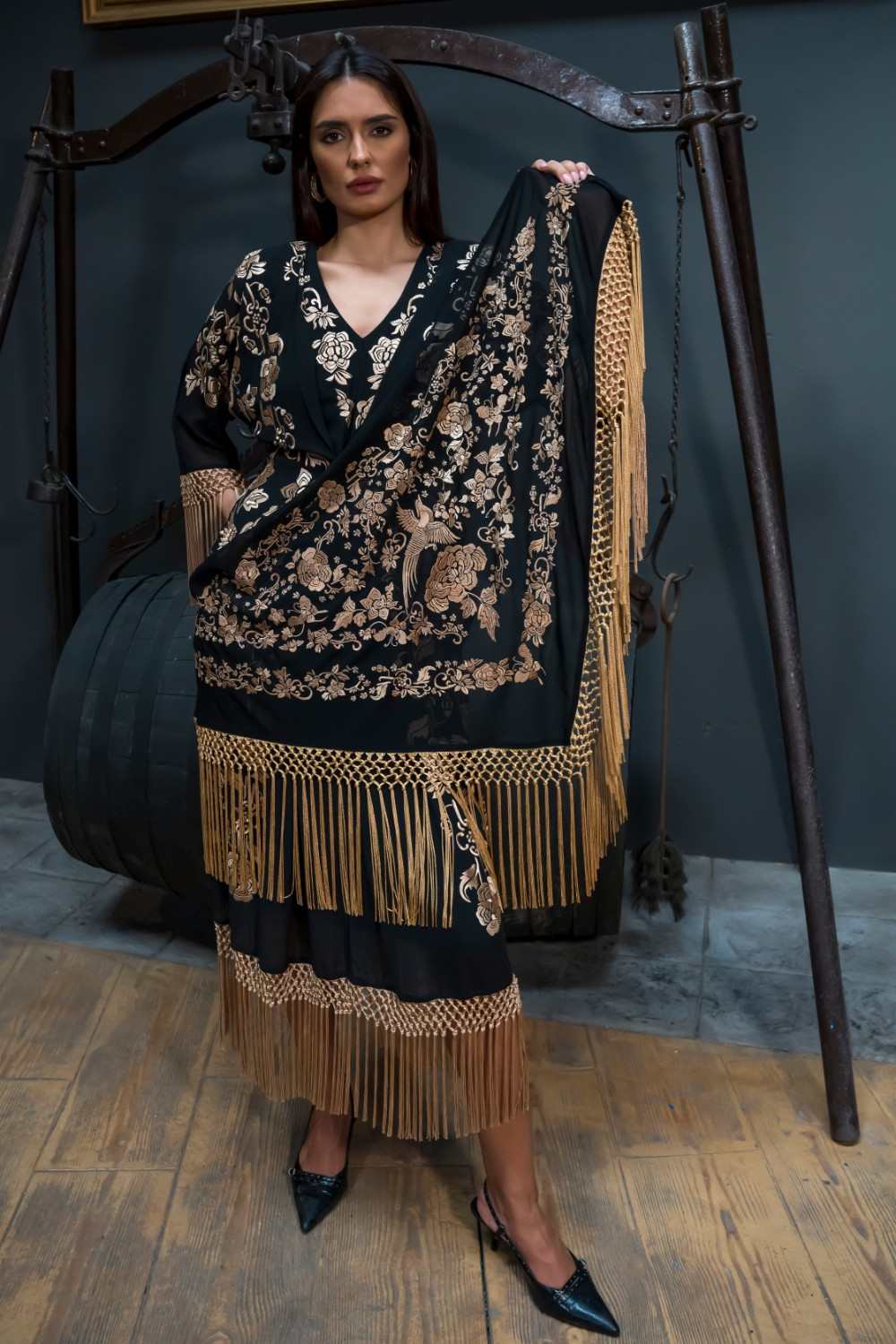 Mantón Manila negro bordado en beige dorado y flecos en el mismo tono Káhyra