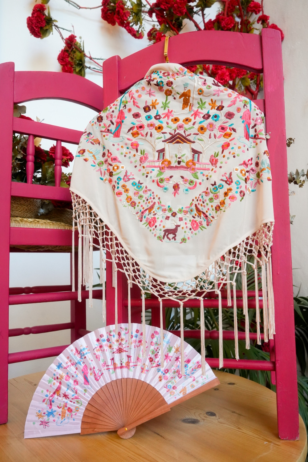 Mantón Loto marfil bordado antiguo con motivos chinos Káhyra