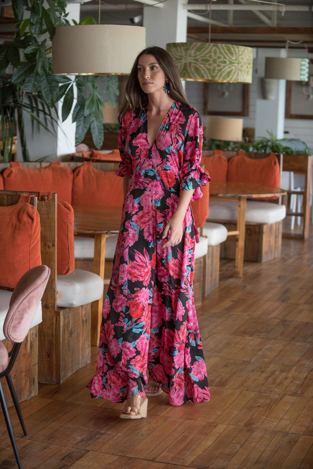 Mono estampado flores fucsias y rojas Amapolas con volantes en mangas al codo y escote y espalda en pico. COMPOSICIÓN: 70% POLIESTER 30% SEDA