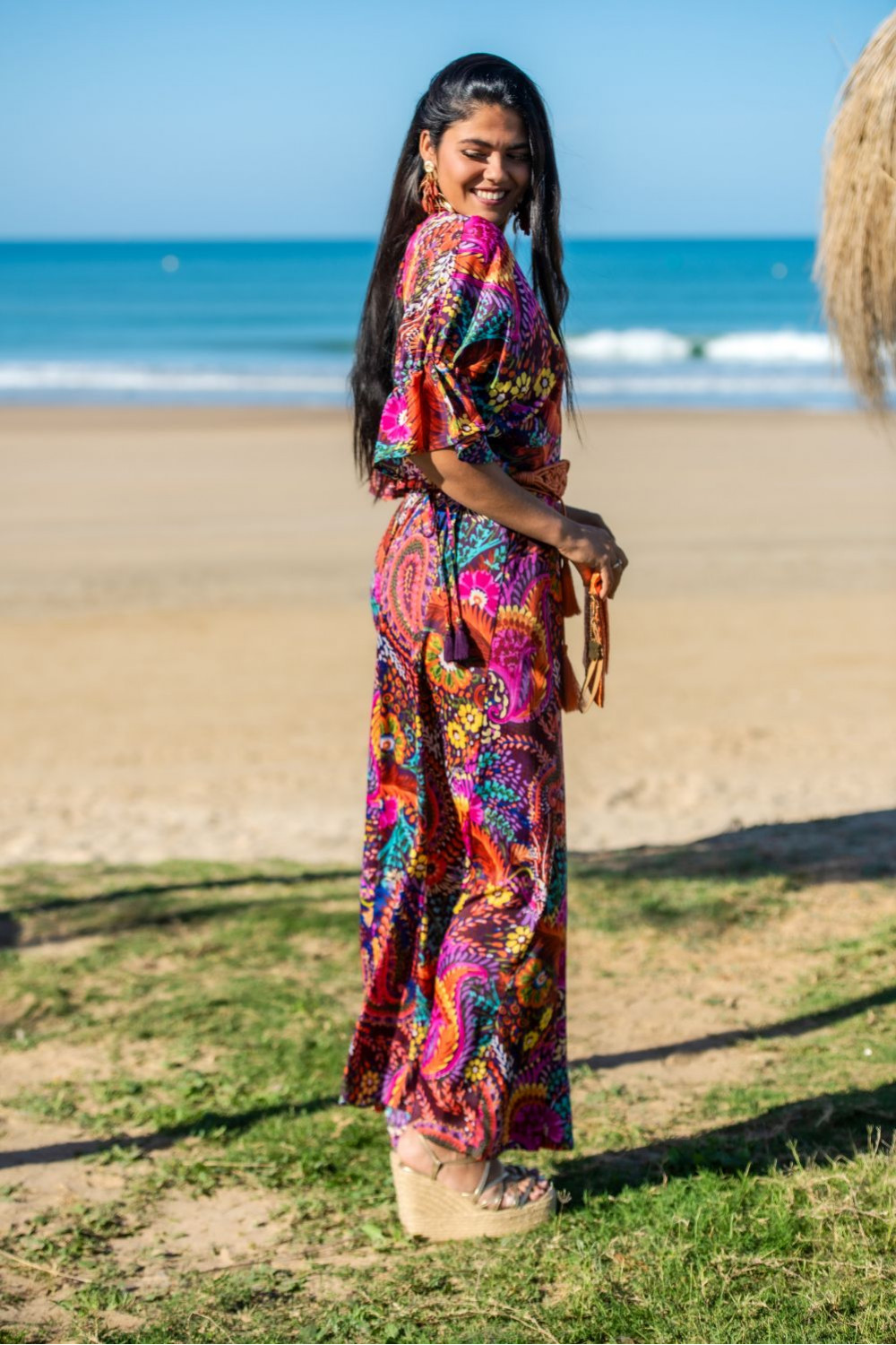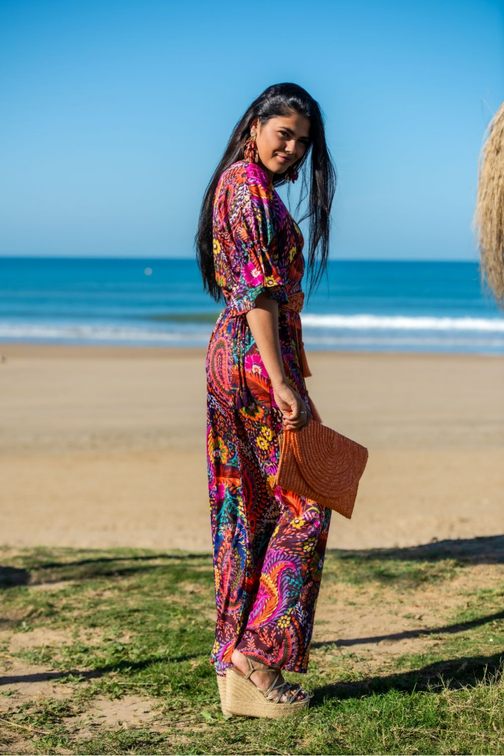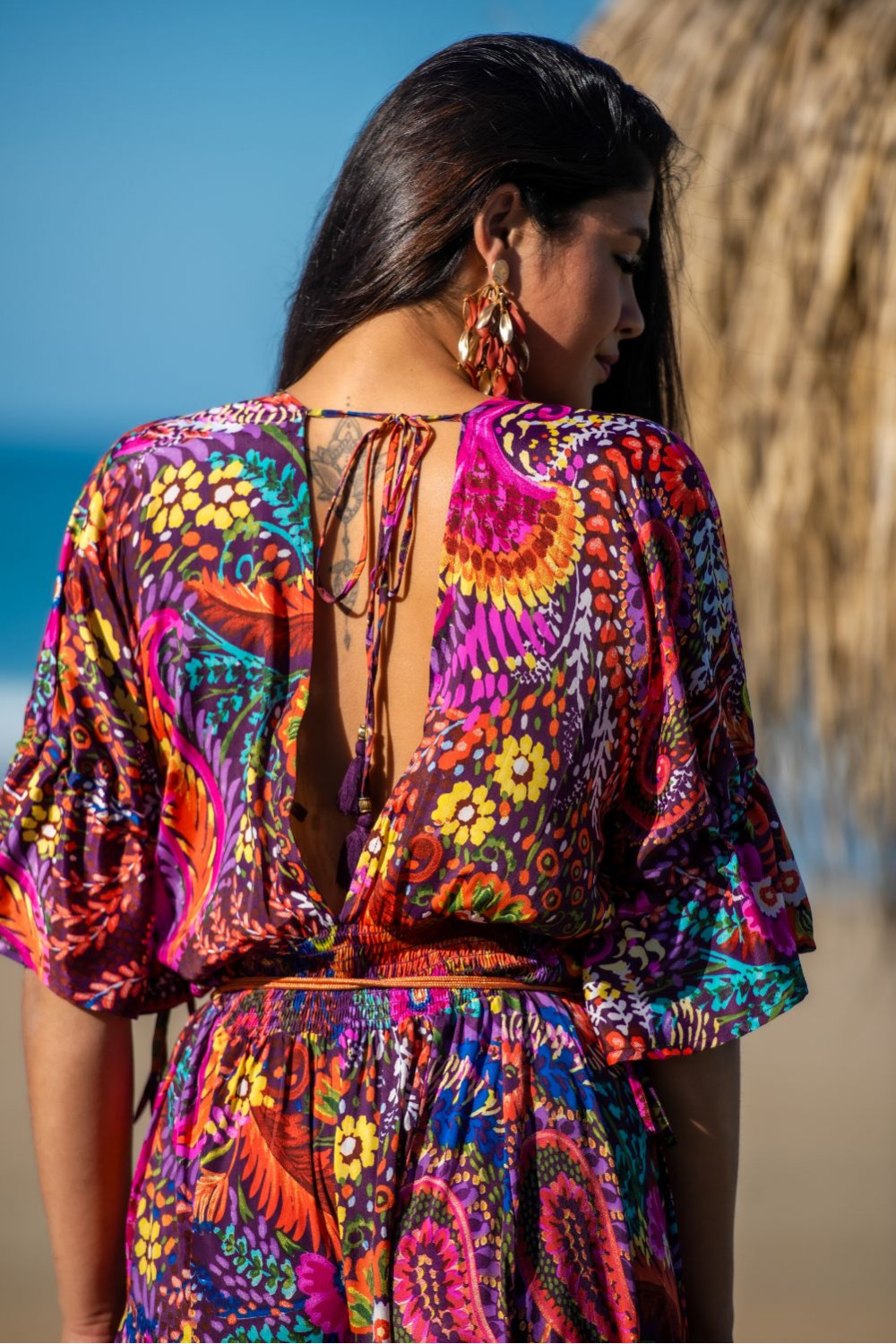 Vestido gomera de polysilk estampado con palmeras multicolor con 2 volantes canasteros , tirantes, fruncido bajo pecho y espalda descubierta con volante.CALIDAD: 70% POLIESTER 30% SEDA