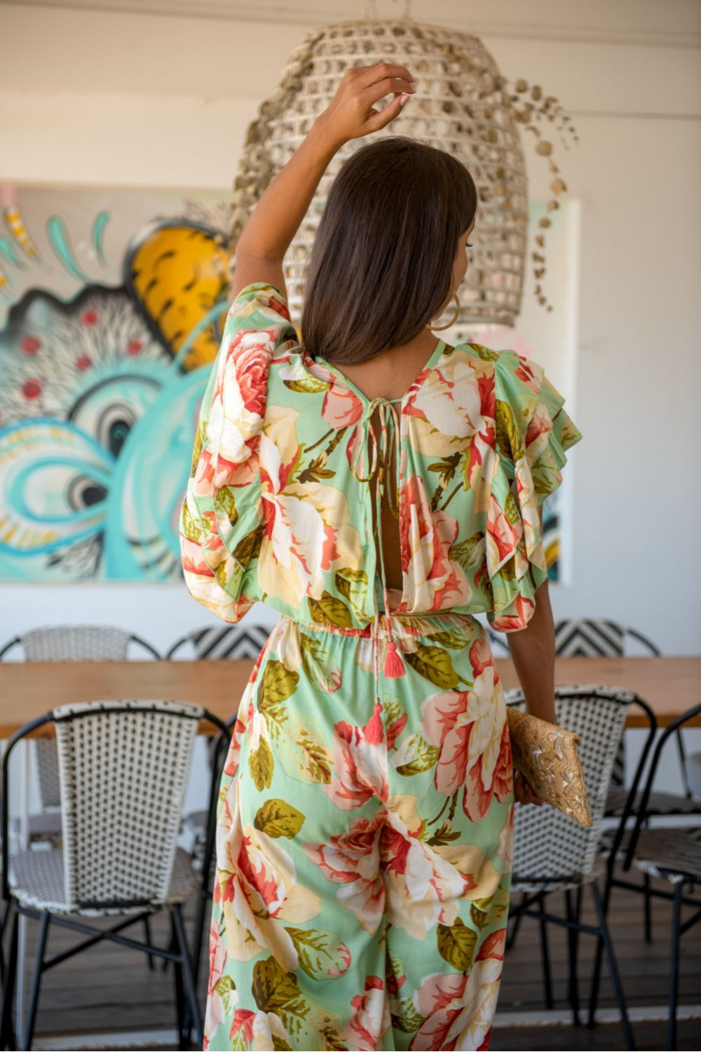 Mono formentera de viscosa estampado verde agua con grandes rosas color maquillaje y coral sin mangas con doble volante en el hombro, cintura fruncida escote cruzado delante y en la espalda.