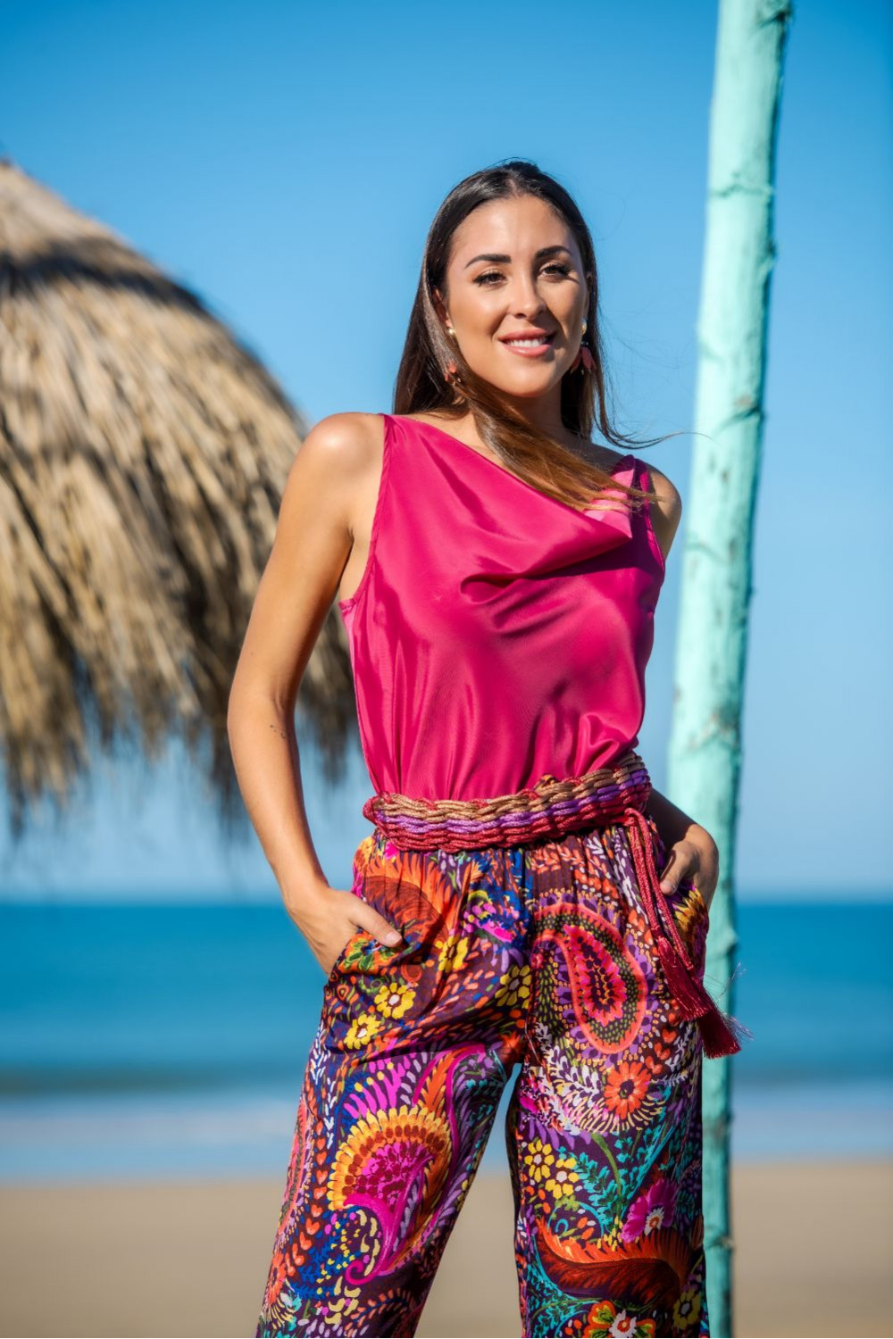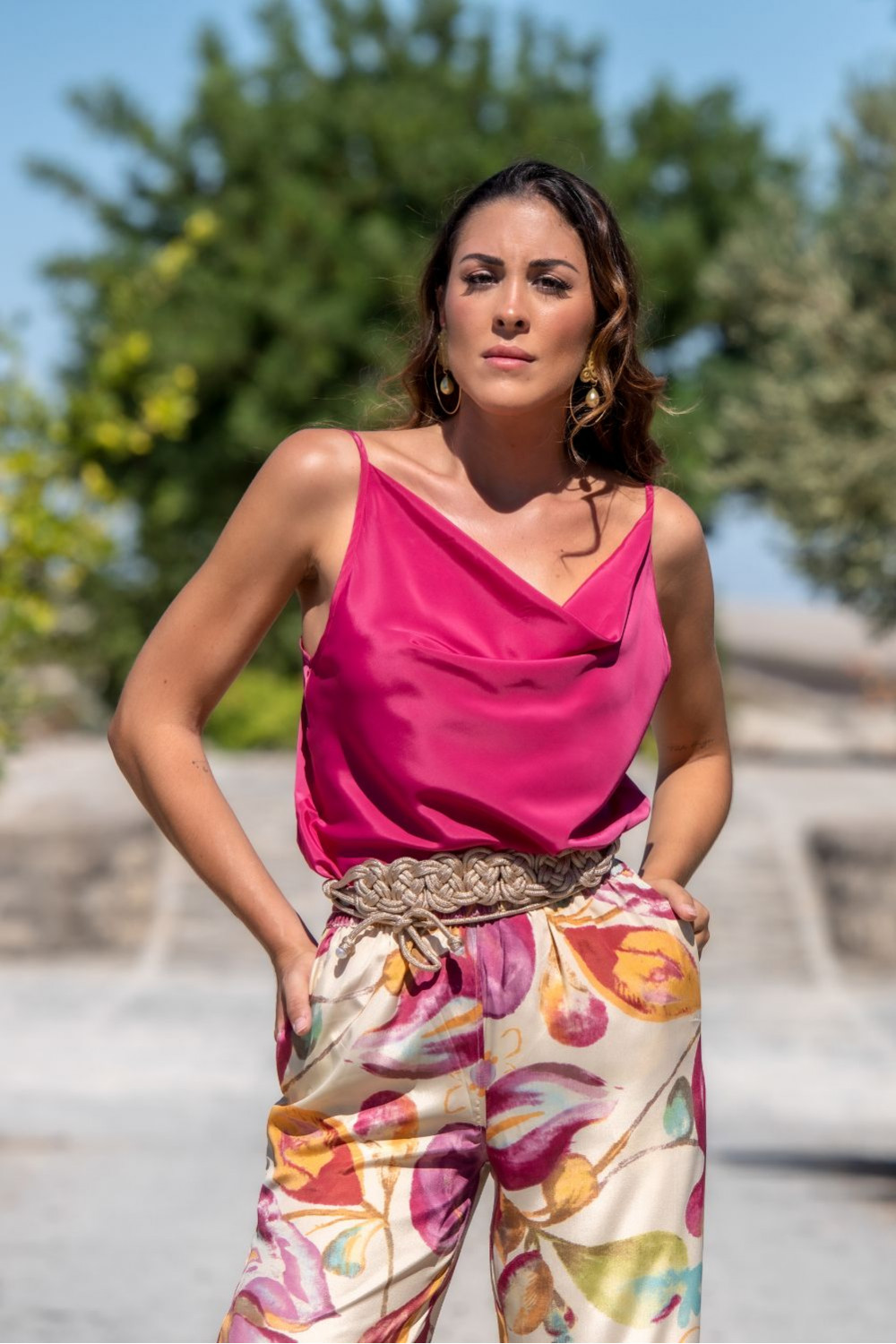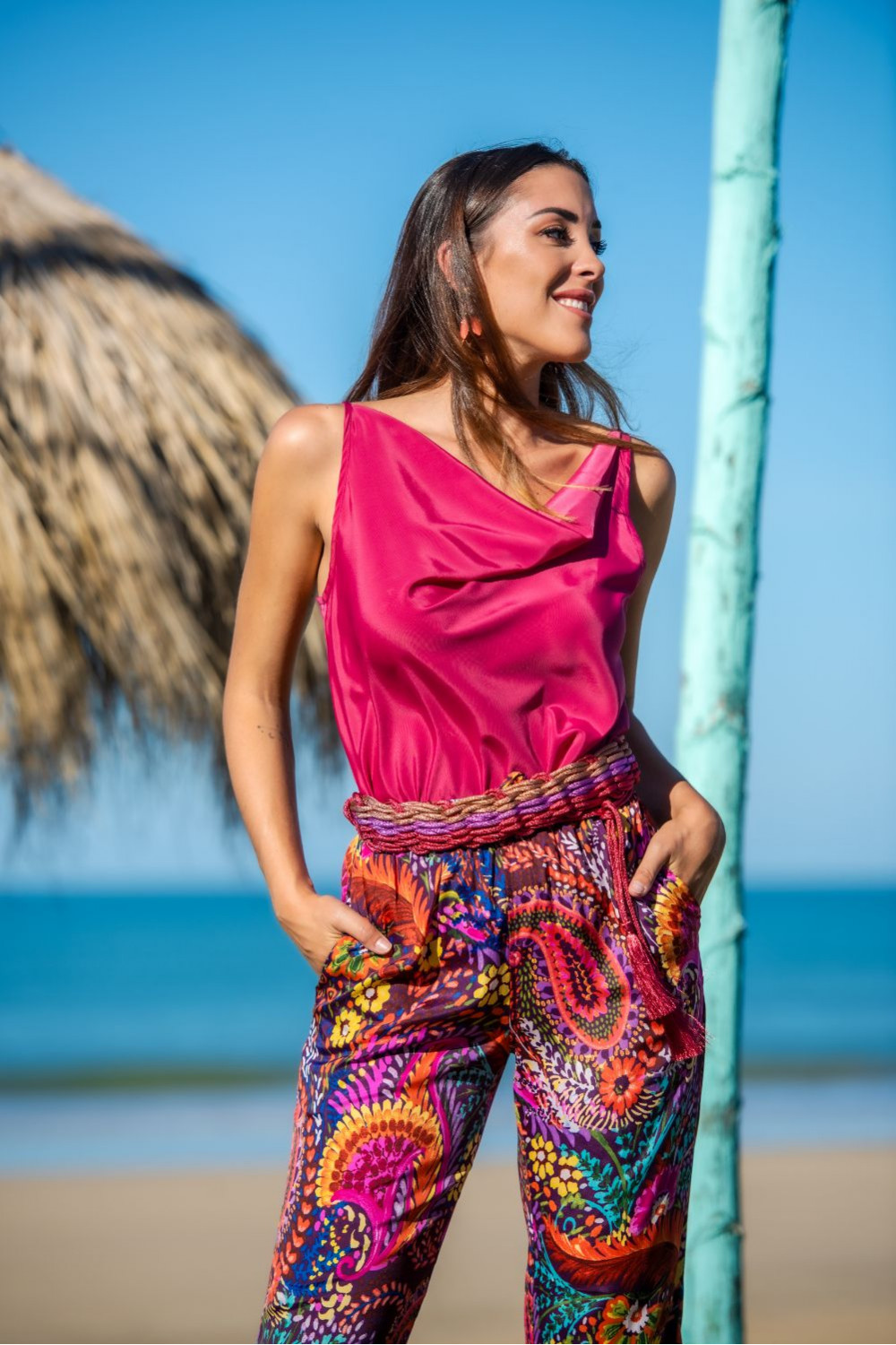 Top sol azul sunset & moon polysilk con tirantas y cuello bocón.CALIDAD: 70% POLIESTER 30% SEDA