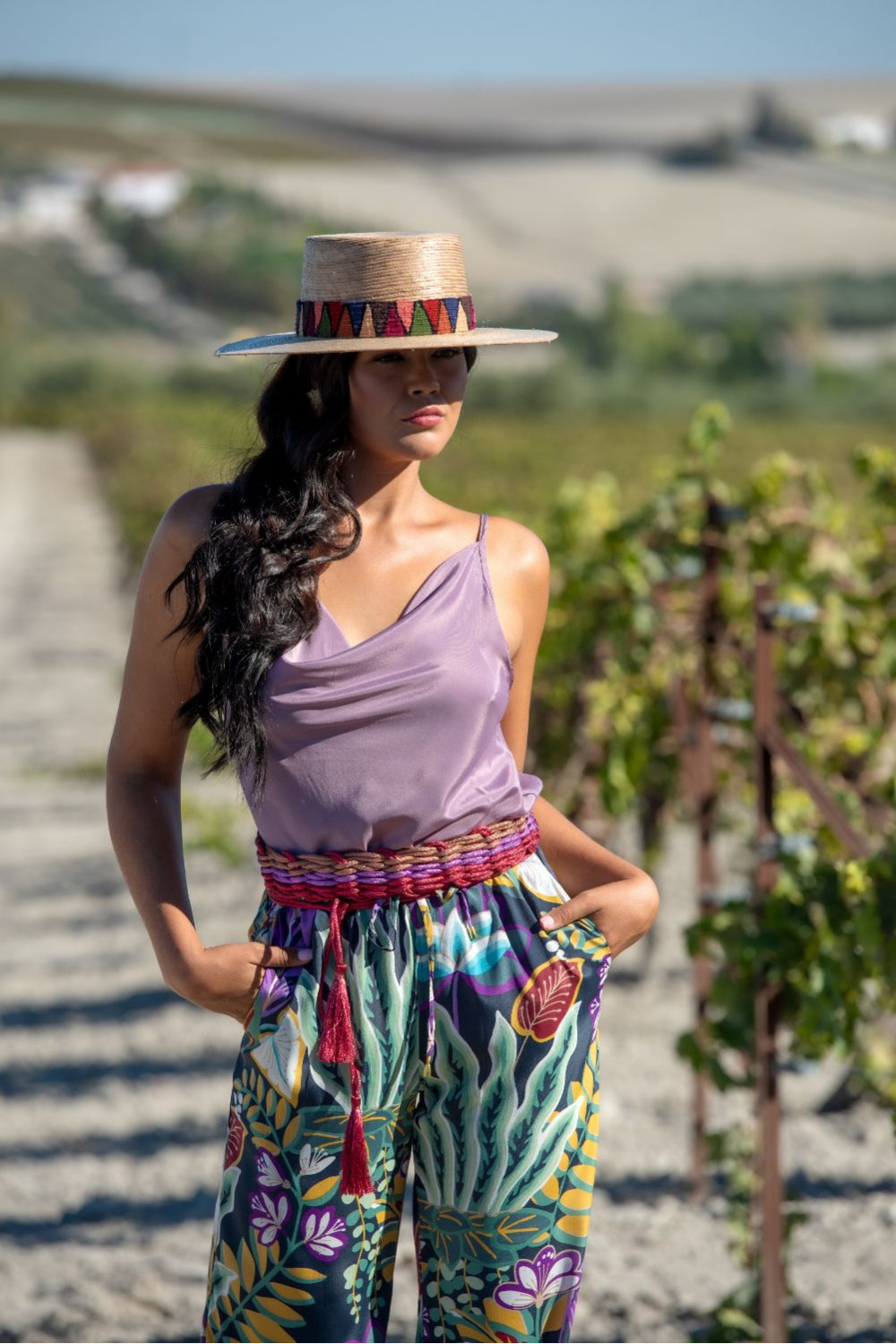 Top sol lila sunset & moon polysilk con tirantas y cuello bocón.