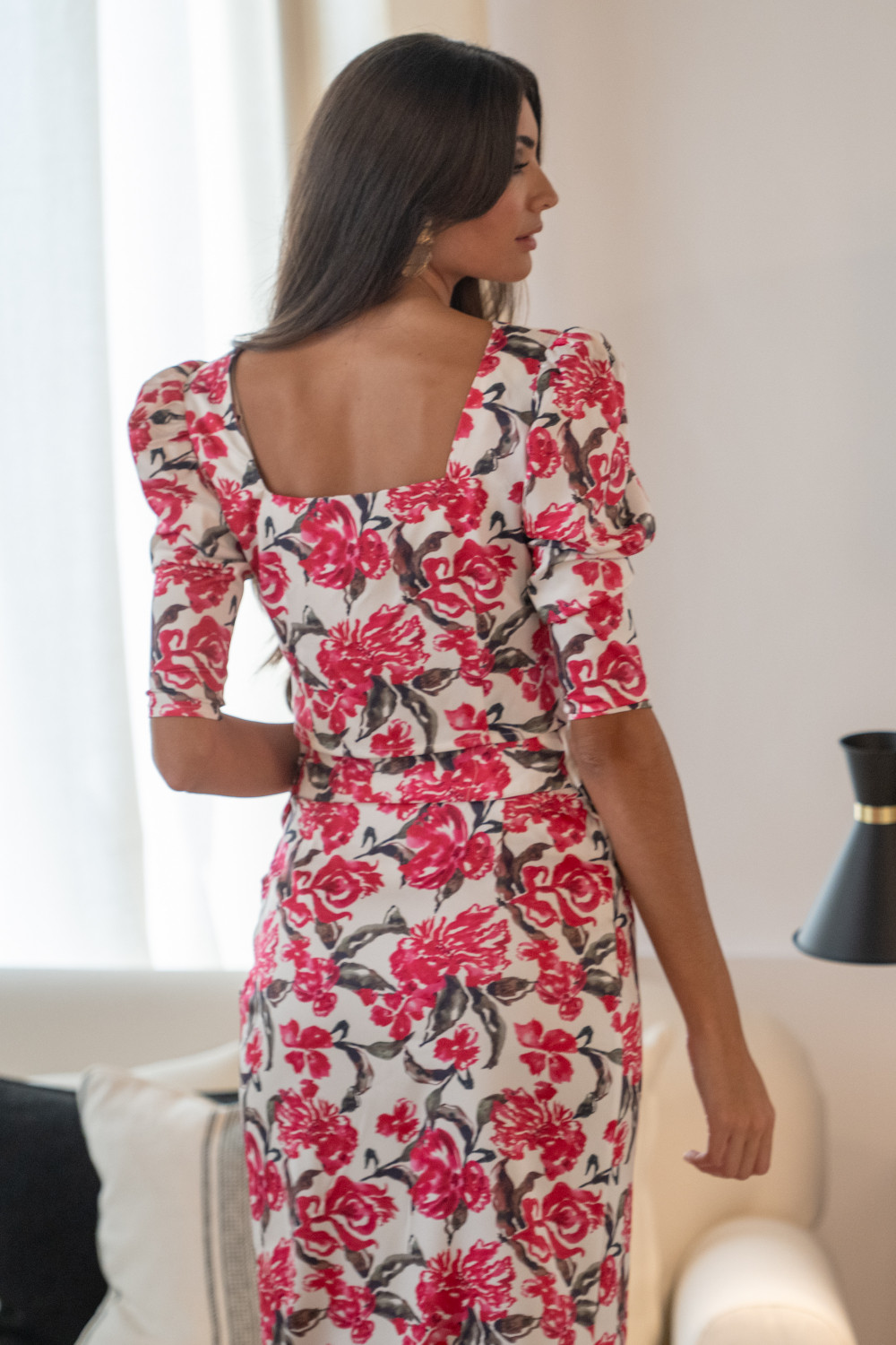 Top fondo blanco con flores fucsias corto, abierto abotonado por delante, escote corazón, manga francesa. Calidad: 97% Poliester 3% Spandex